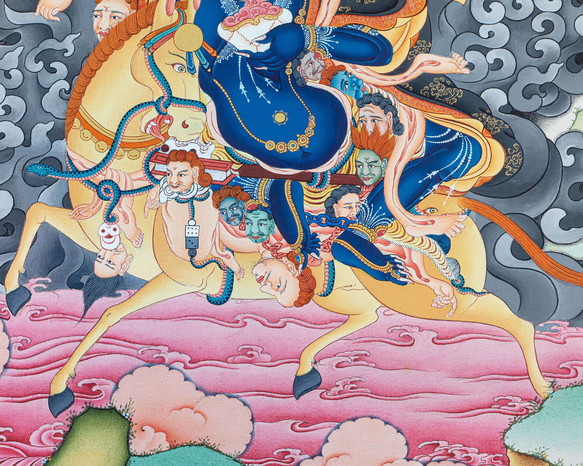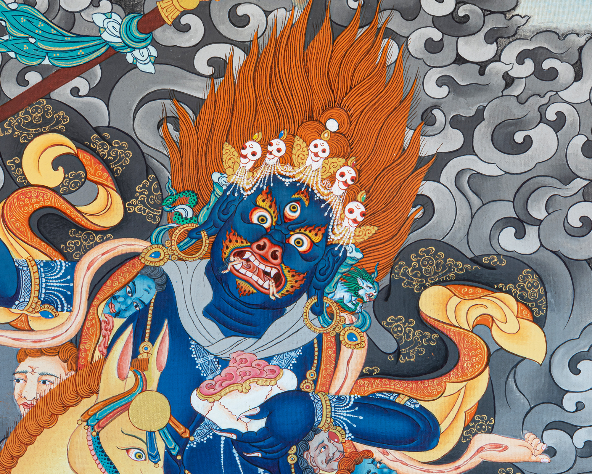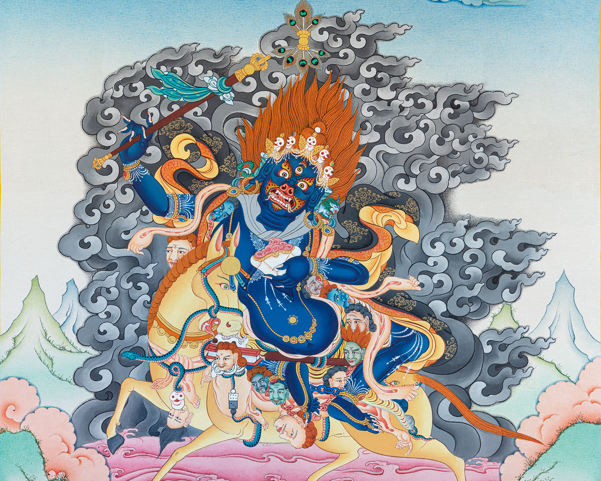 This striking Palden Lhamo Thangka portrays the powerful female protector of Tibetan Buddhism, revered as the fierce guardian of the Dharma and a special protector of Tibet and its spiritual traditions. Riding across the sea of blood and obstacles, Palden Lhamo appears in her wrathful form to destroy negativity, remove hindrances, and protect sincere practitioners. Her terrifying appearance is not born from anger, but from boundless compassion acting with unstoppable force.