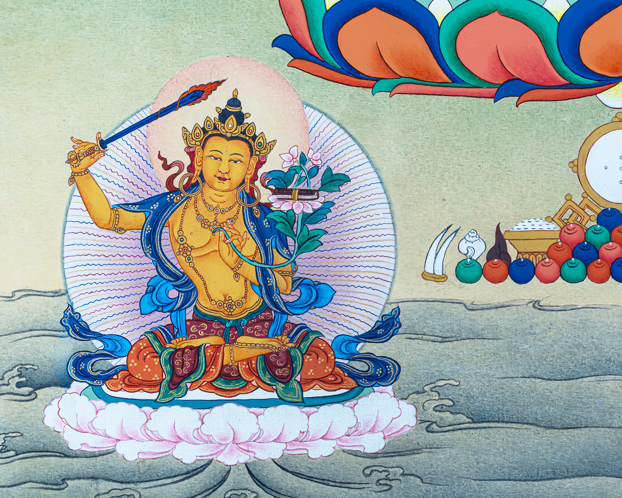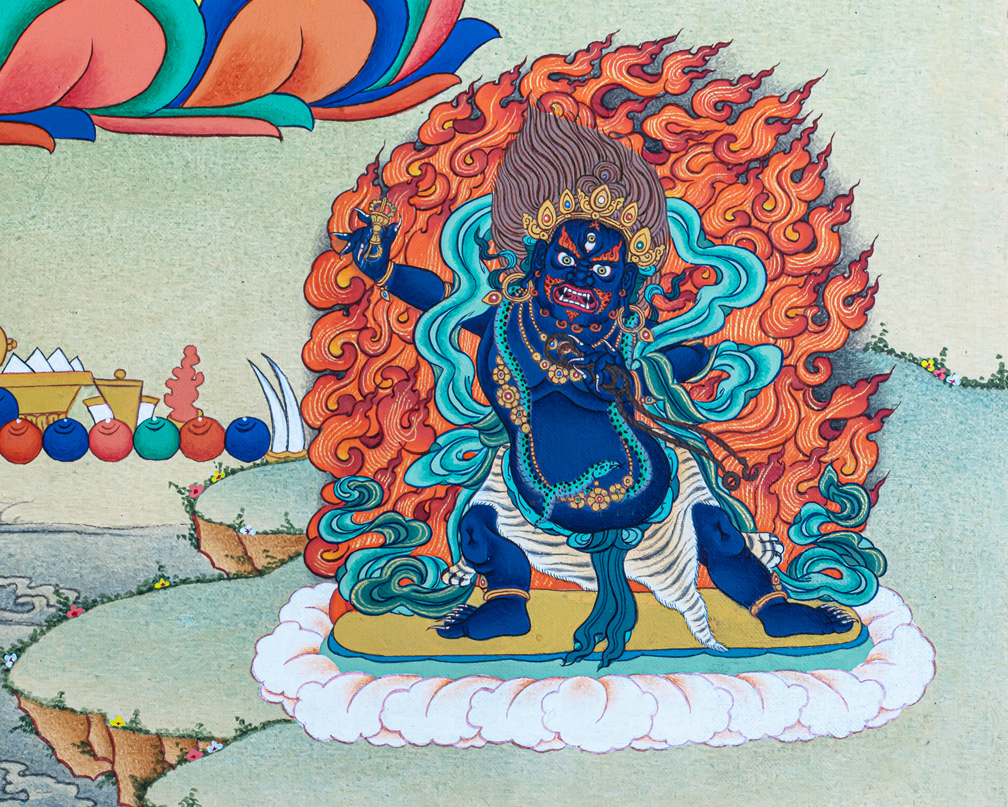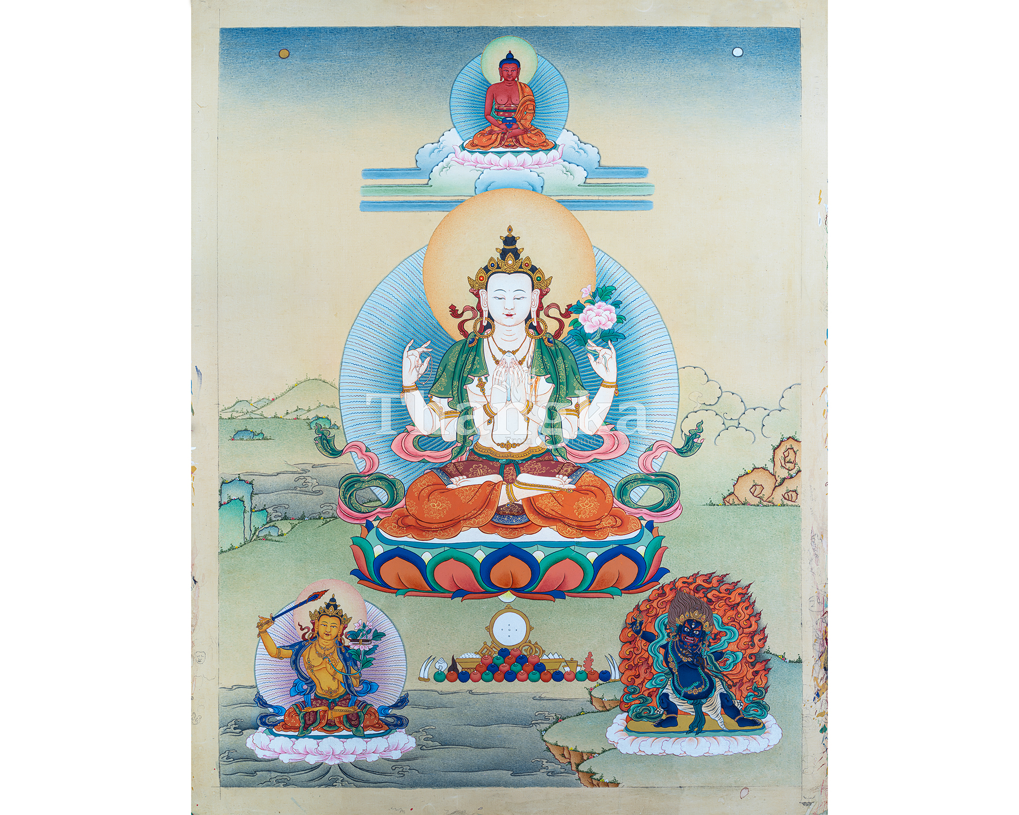 P.S. All thankas are painted taking references from Buddhist books following the correct iconography and by master artists, making it authentic traditional handmade Tibetan art. The subtle facial expression is one factor to distinguish the real effort put into creating this masterpiece.