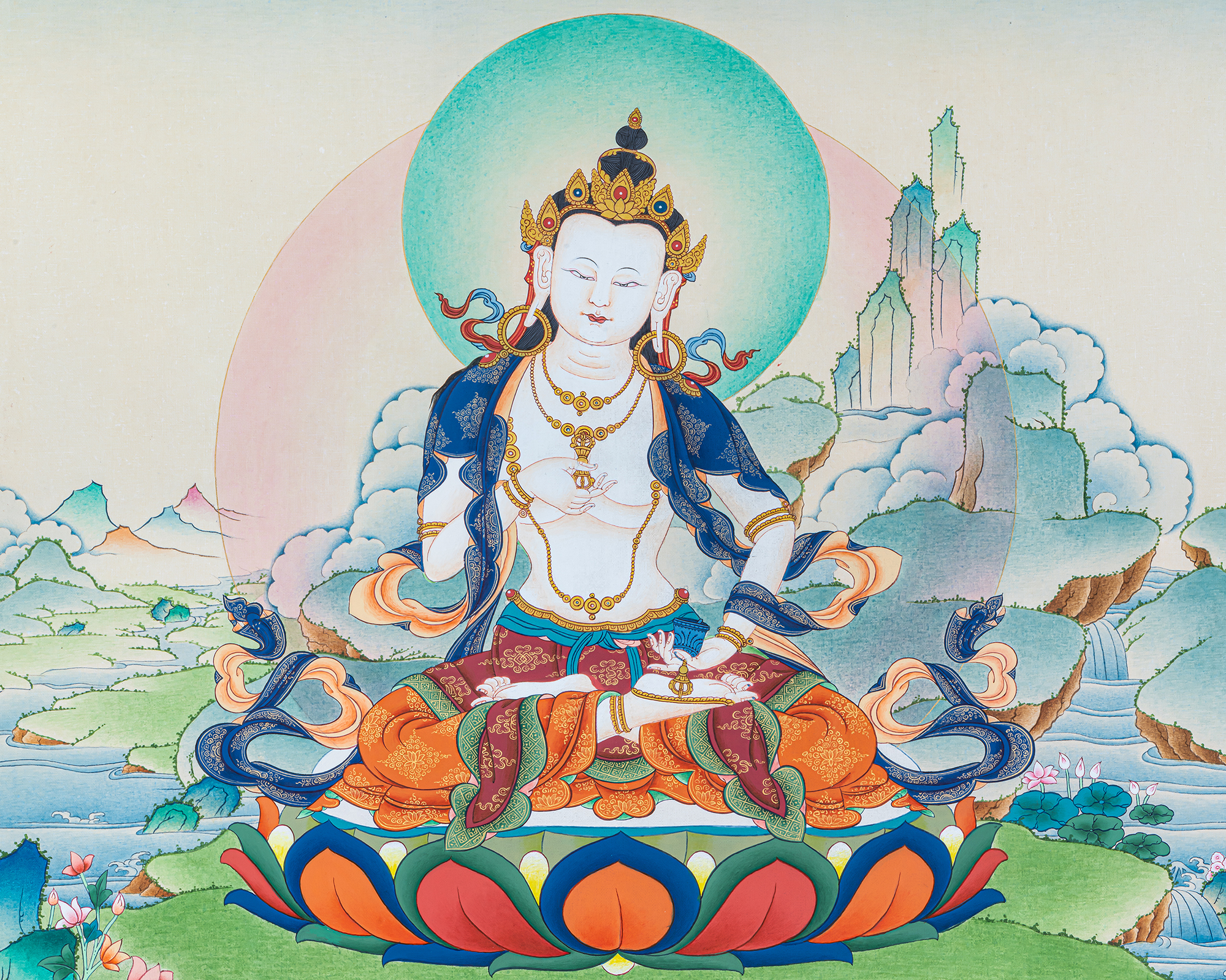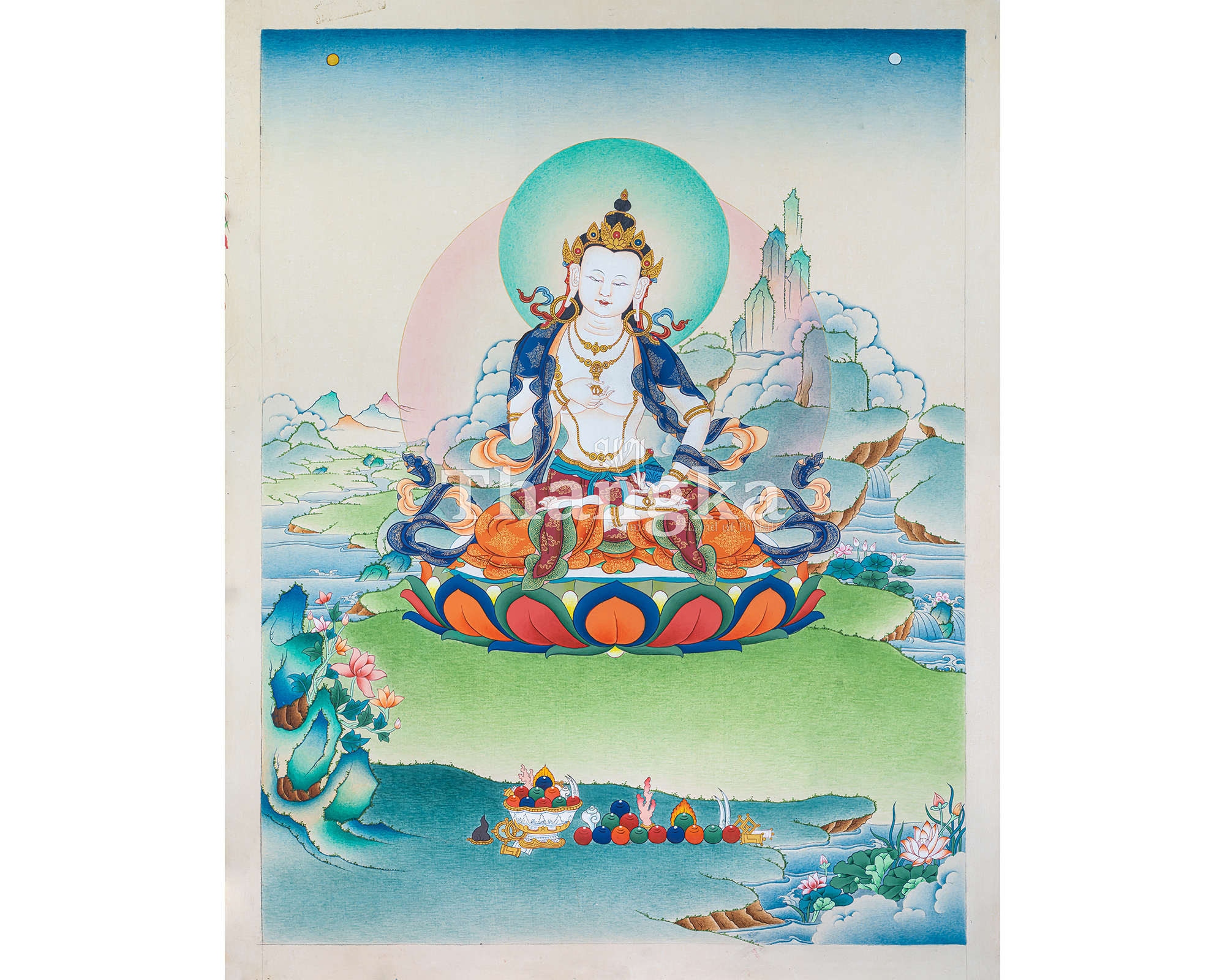 This serene Vajrasattva Thangka depicts the luminous Buddha of purification, revered in Vajrayana Buddhism for his power to cleanse negative karma, obscurations, and emotional afflictions. Seated in peaceful meditation on a lotus and moon seat, Vajrasattva holds the vajra and bell, symbolizing the inseparable union of method and wisdom. His pure white form represents the clarity of the awakened mind and the possibility of renewal for all beings.