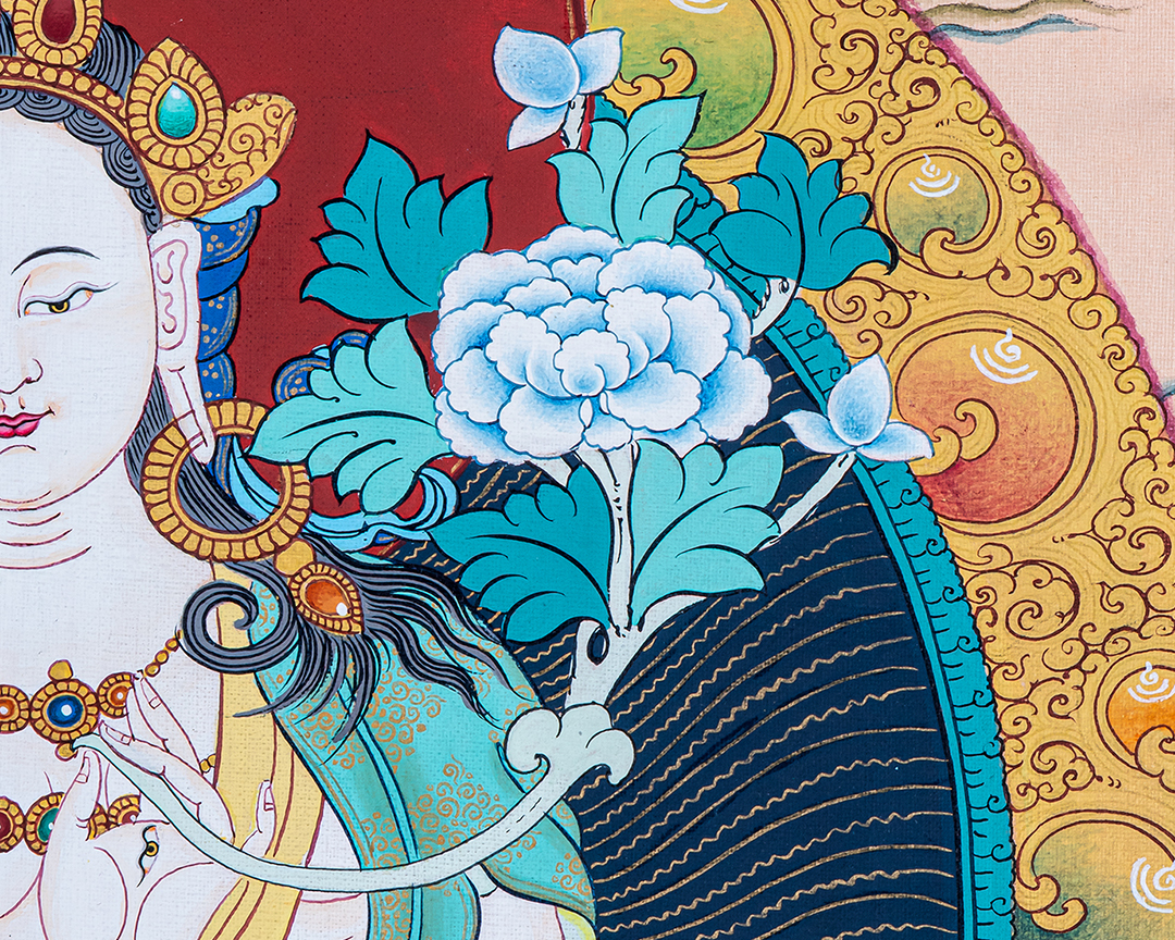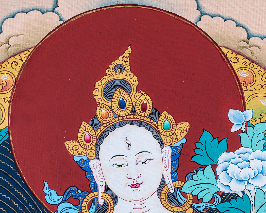 She is seen as the female aspect of the ultimate reality, and her name, "White Tara," reflects her pure and compassionate nature. She is often depicted as a beautiful woman dressed in white robes, with seven eyes symbolizing her awareness of all beings' suffering.