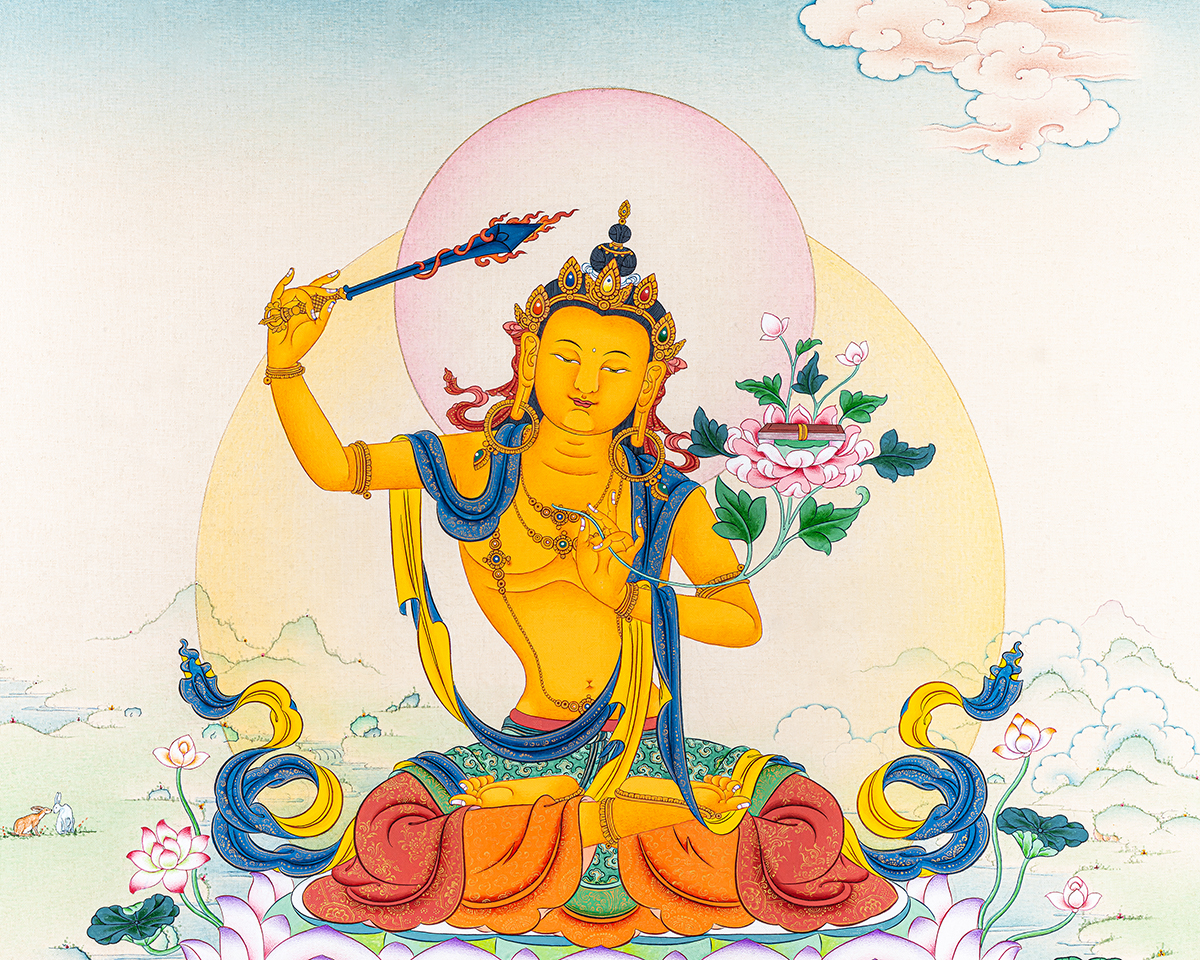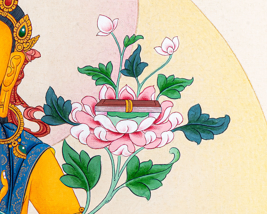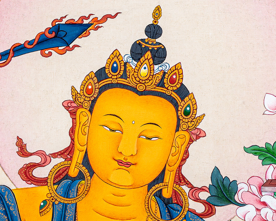 In Buddhist Thangka painting, Manjushri is typically depicted holding a flaming wisdom sword in his right hand and a lotus supporting the Prajnaparamita scripture in his left. These sacred symbols represent the illumination of wisdom and the transcendence of ignorance.