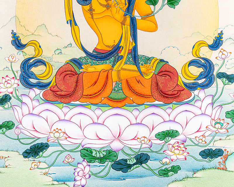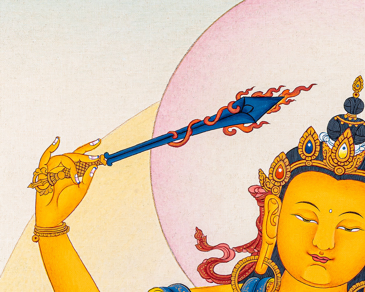 This authentic Manjushri Thangka is a stunning example of handmade Tibetan Thangka painting created by skilled Himalayan artists following centuries-old traditions. In traditional Himalayan Thangka art, Manjushri is revered as the Bodhisattva of Wisdom who cuts through ignorance and illusion with the sword of knowledge.