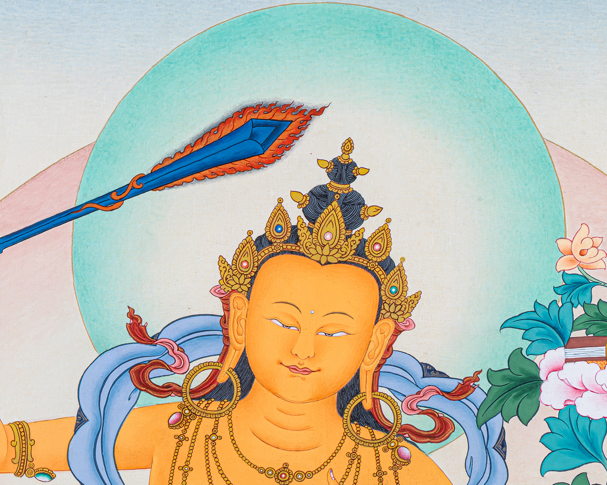 He wields the flaming sword of discriminating wisdom to cut through confusion, attachment, and ignorance. Resting upon a lotus that supports the Prajñāpāramitā text, Manjushri teaches the union of wisdom and compassion. His presence inspires mental clarity, eloquence, sharp memory, and confidence in both worldly learning and spiritual study.