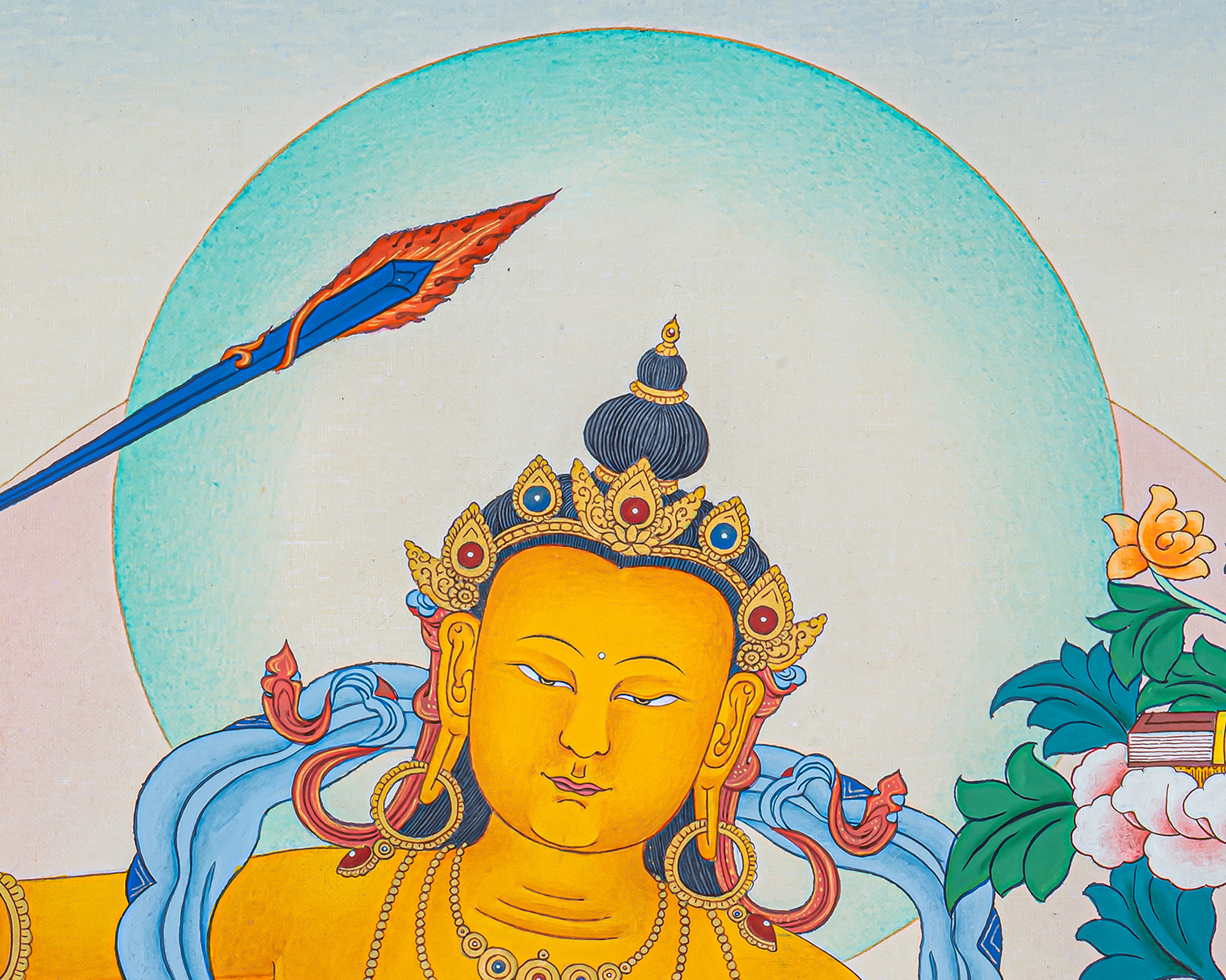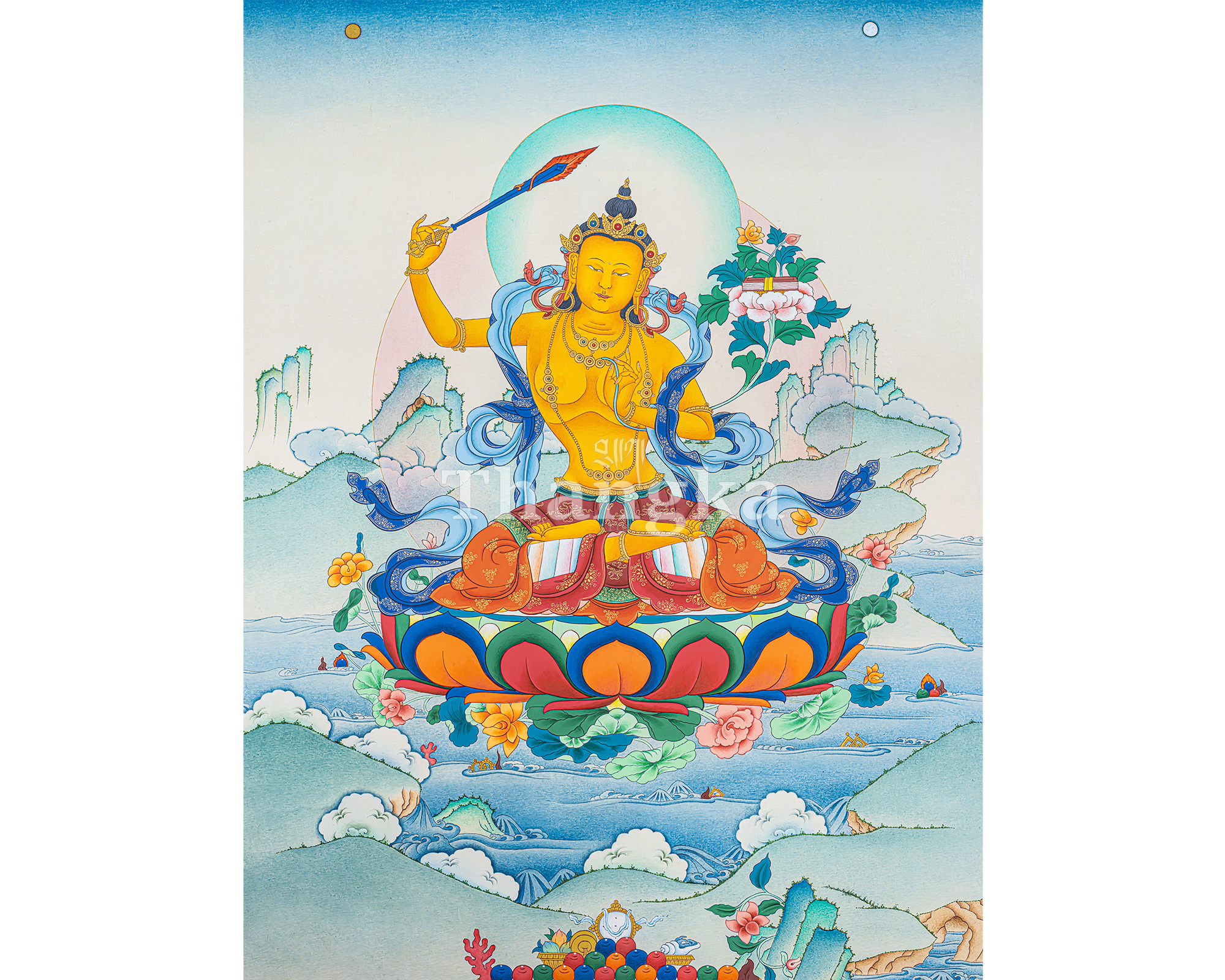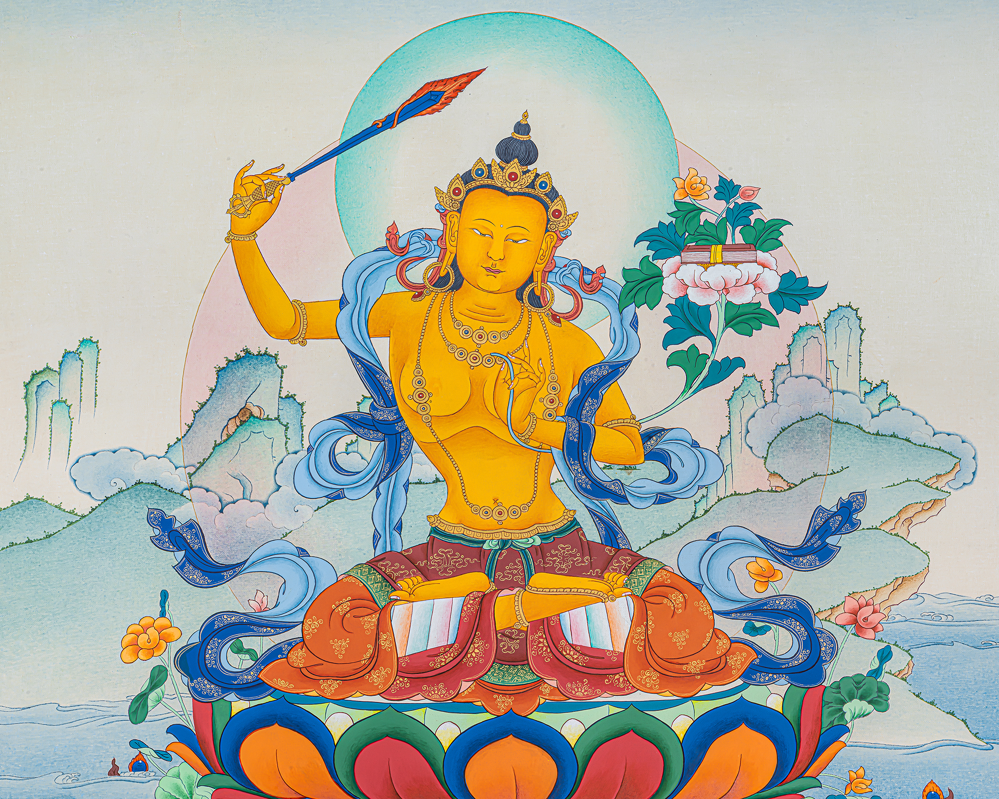 He raises the flaming sword of wisdom to cut through delusion, while the Prajñāpāramitā scripture resting on a lotus proclaims the ultimate teaching of emptiness and compassion. Through devotion and meditation on Manjushri, practitioners cultivate sharp intellect, clear understanding, eloquent speech, and deep insight into the Dharma.