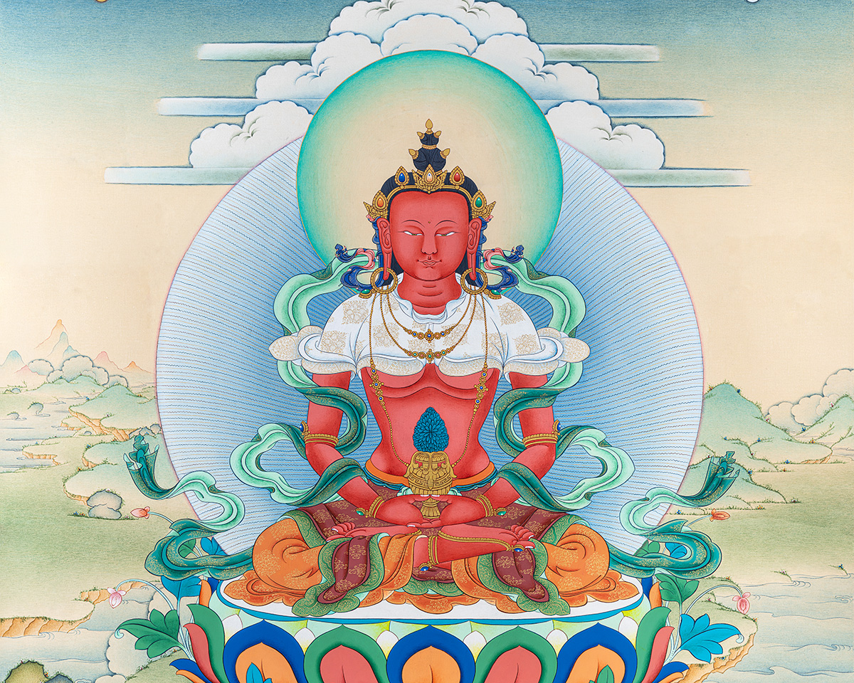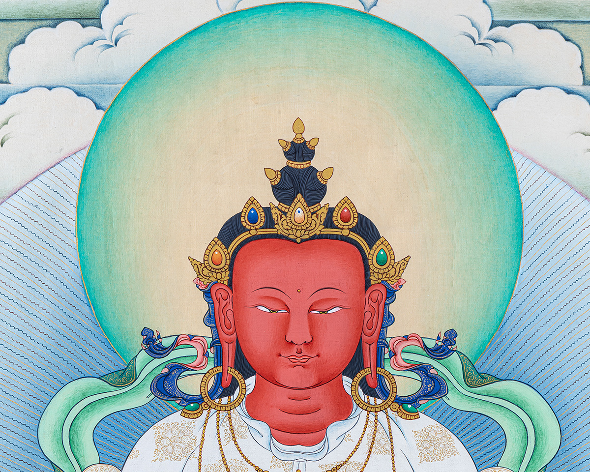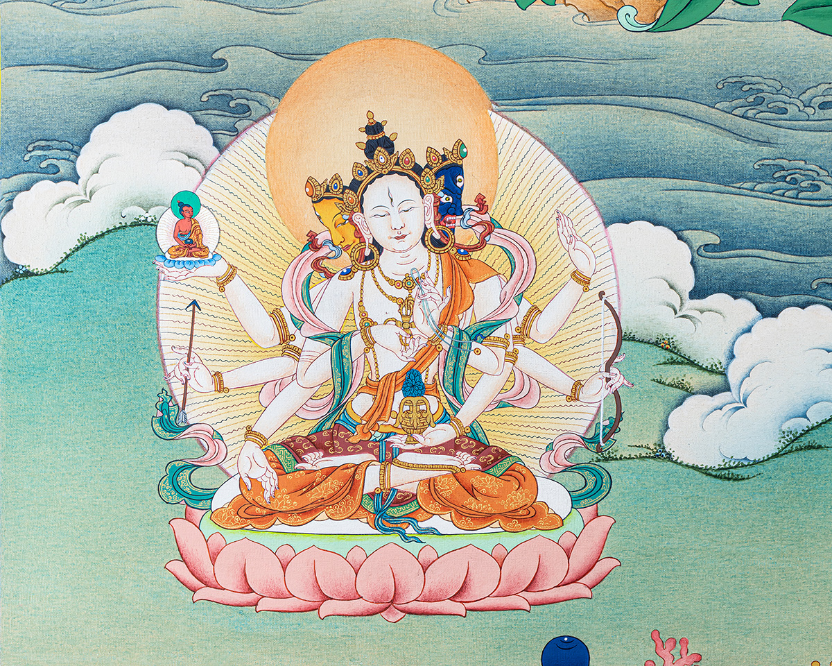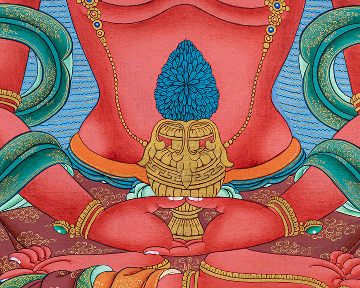 This Buddhist Thangka Painting is deeply connected to longevity rituals and Tibetan Buddhist Meditation Thangka practices, where practitioners seek blessings for a long, healthy, and meaningful life.
