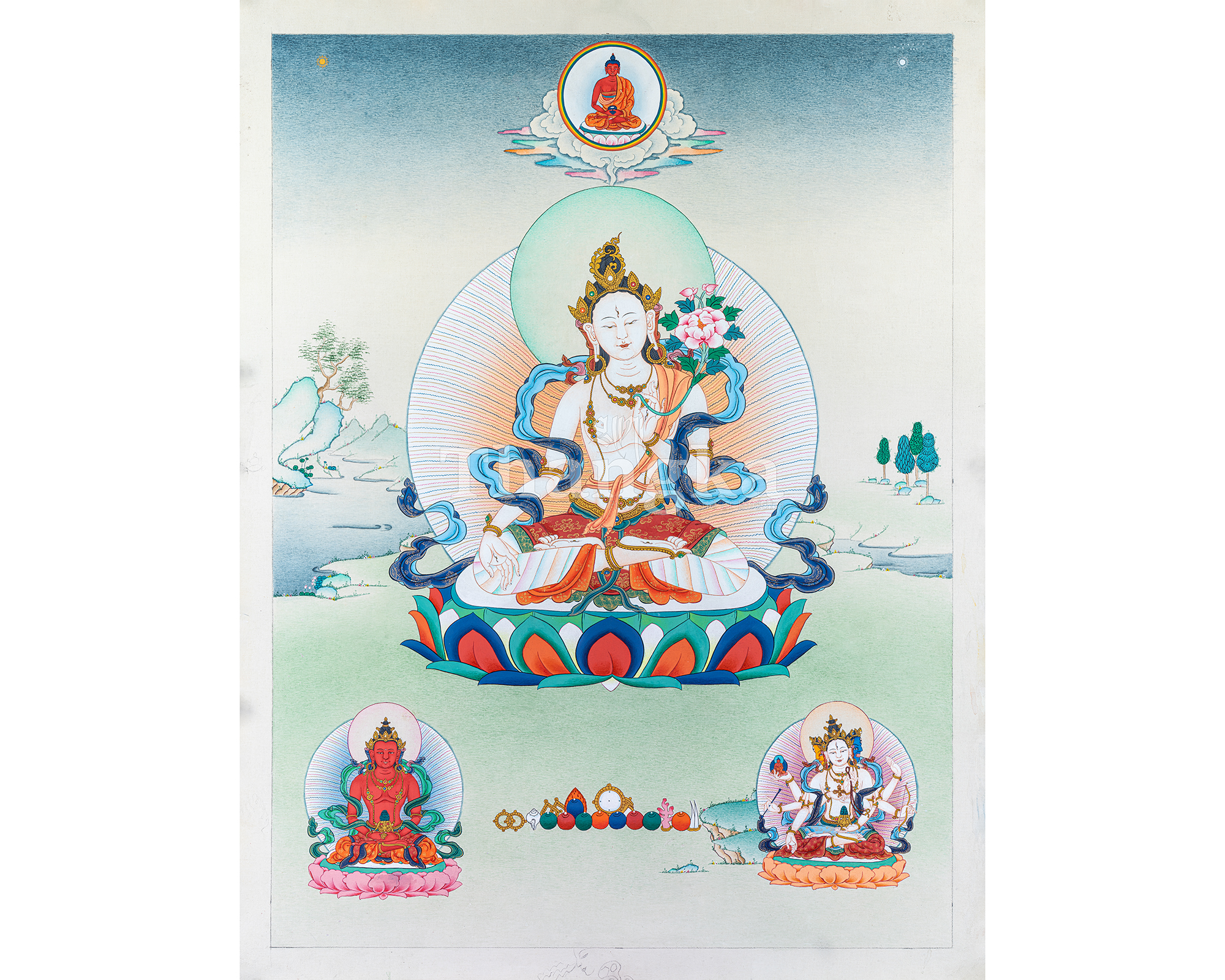Hand-painted in the traditional Himalayan thangka style, this sacred artwork is ideal for home altars, meditation rooms, monasteries, and healing spaces. Tse Lha Nam Sum is widely practiced for long-life prayers, health, removal of life obstacles, and the accumulation of merit. This thangka serves as both a beautiful devotional image and a powerful support for prayer, mantra recitation, and contemplative practice, bringing blessings, stability, and renewed vitality into any space.