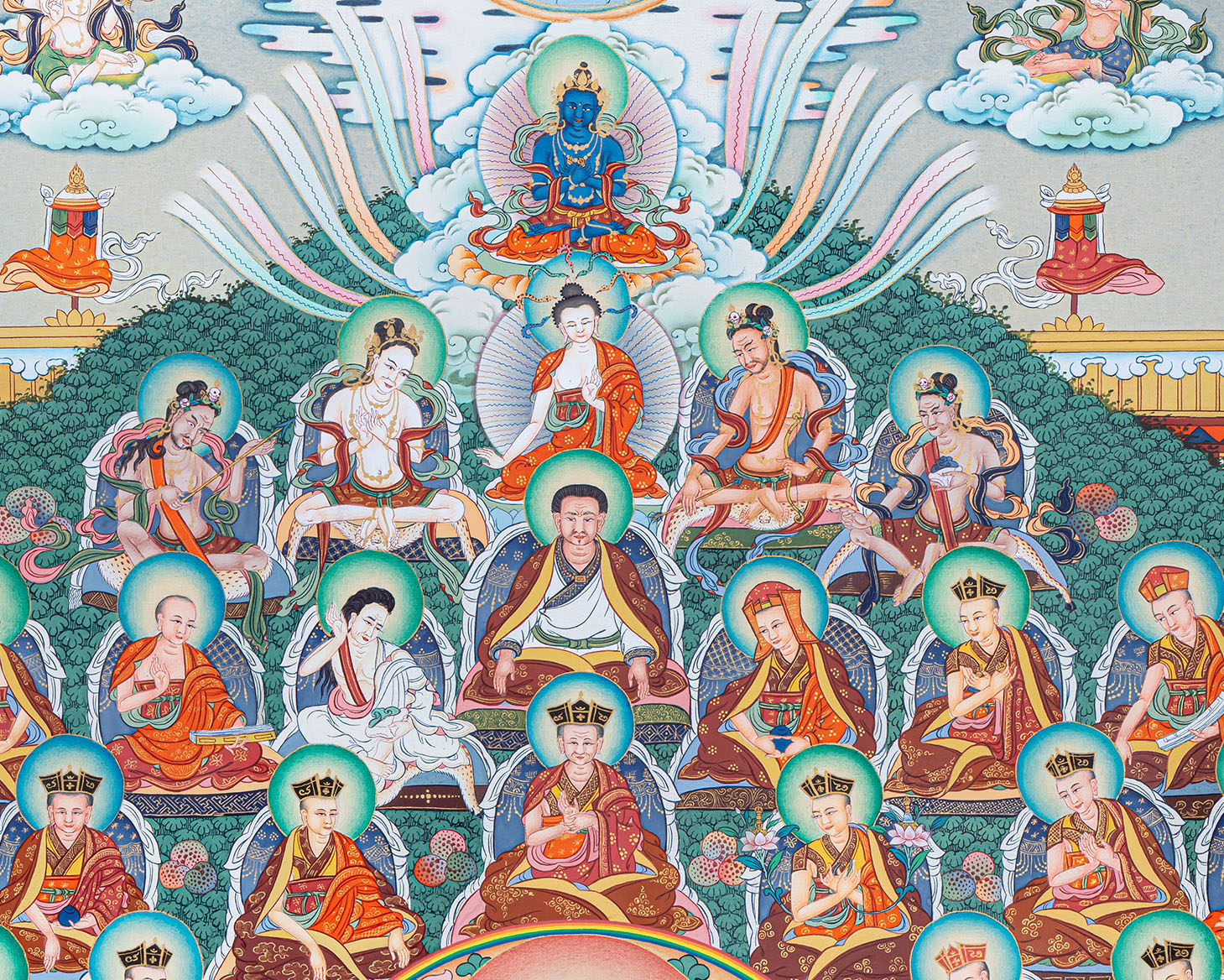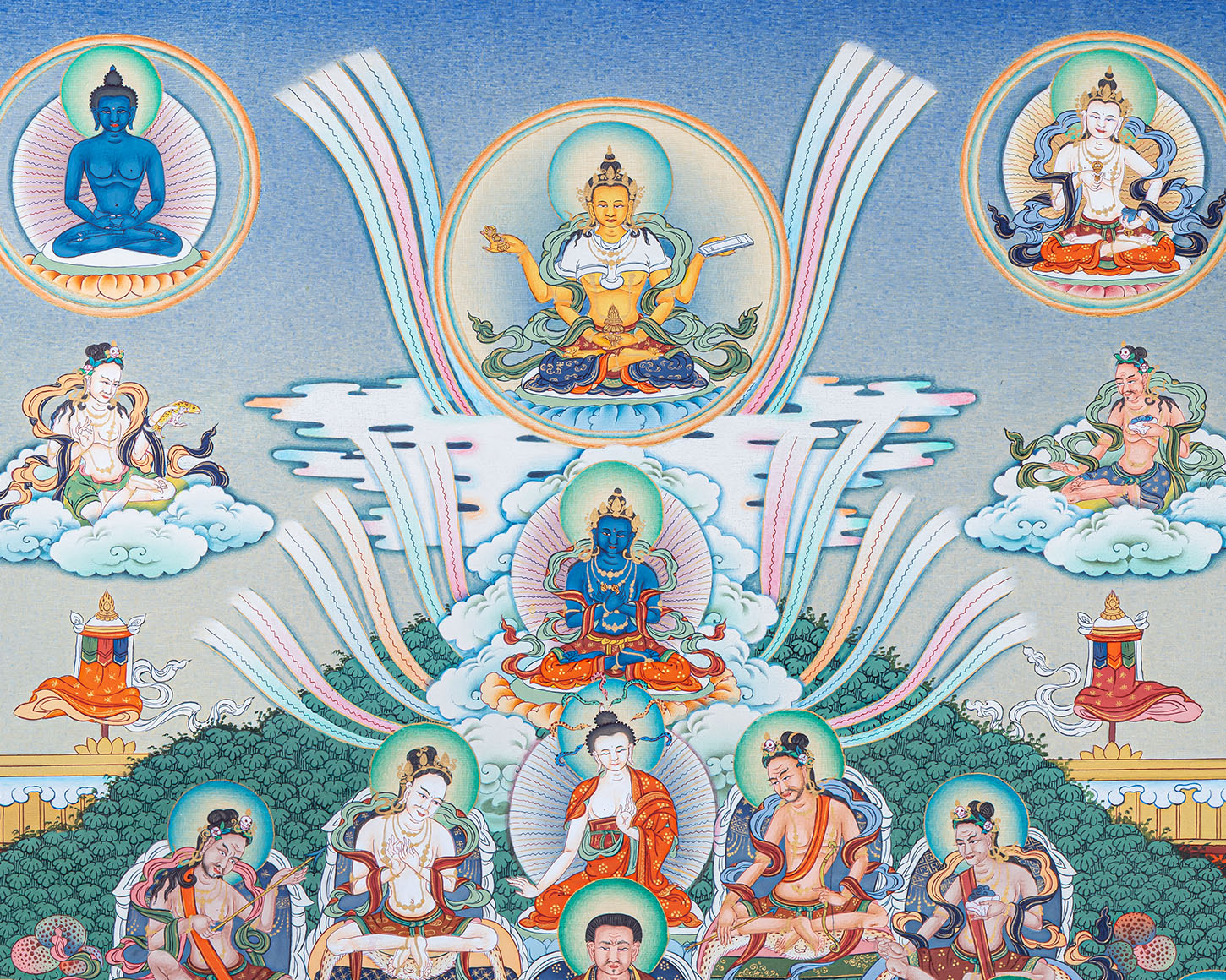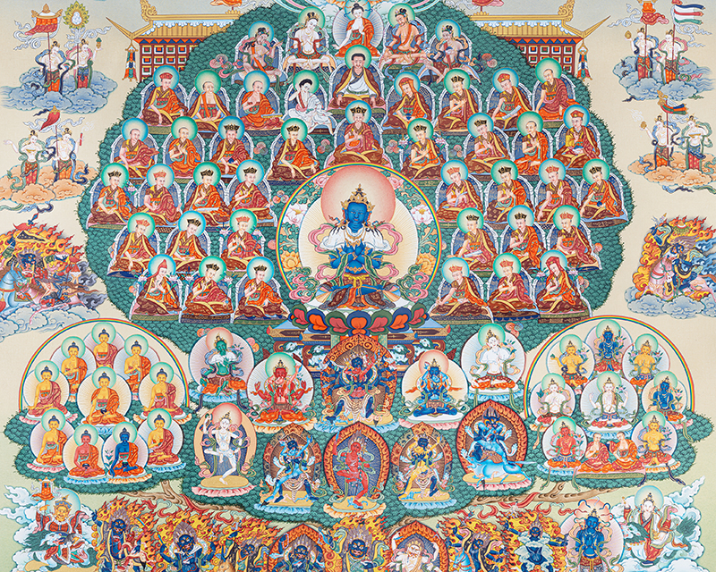 The Choksing (Field of Merit) composition beautifully illustrates the complete lineage of masters, deities, and enlightened beings surrounding Vajradhara, symbolizing the transmission of wisdom and blessings across generations. This sacred arrangement is essential in Tibetan Buddhist meditation thangka