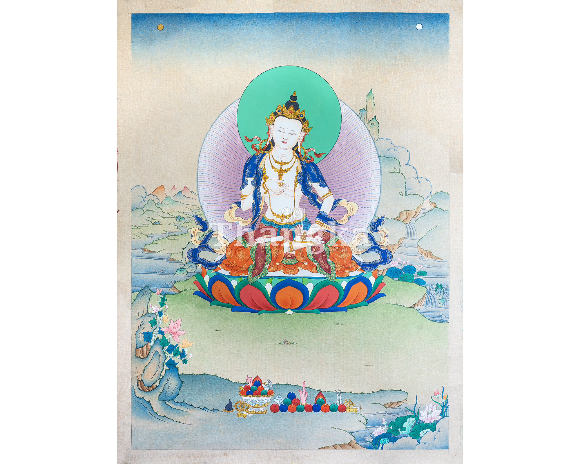 This refined Vajrasattva Thangka presents the Buddha of purification in his luminous, peaceful form, symbolizing the indestructible purity of the awakened mind. Seated on a lotus and moon disc, Vajrasattva holds the vajra and bell, representing the perfect union of skillful means and wisdom. His calm expression and radiant white body color remind practitioners that all negativities and obscurations can be purified through sincere practice and awareness.