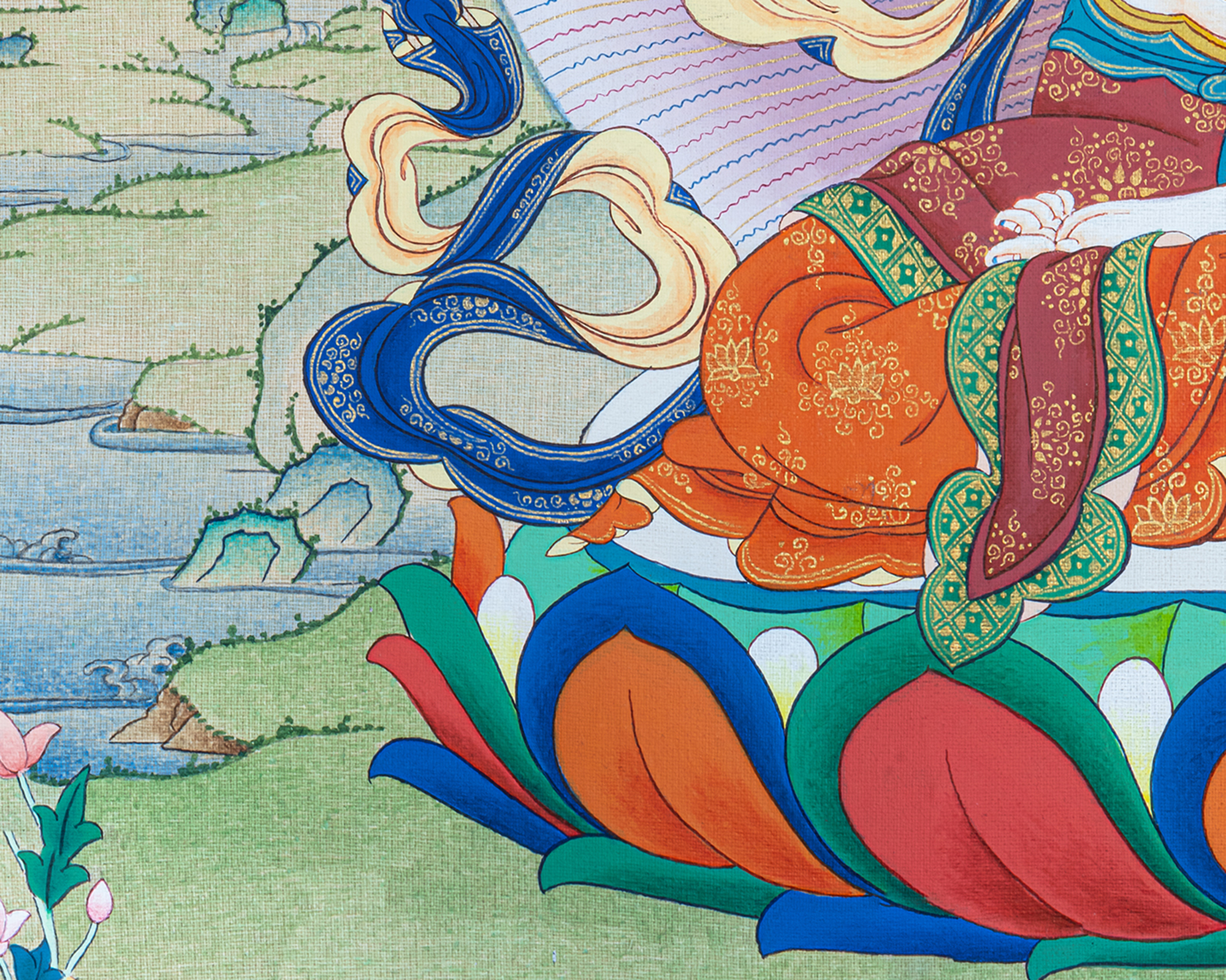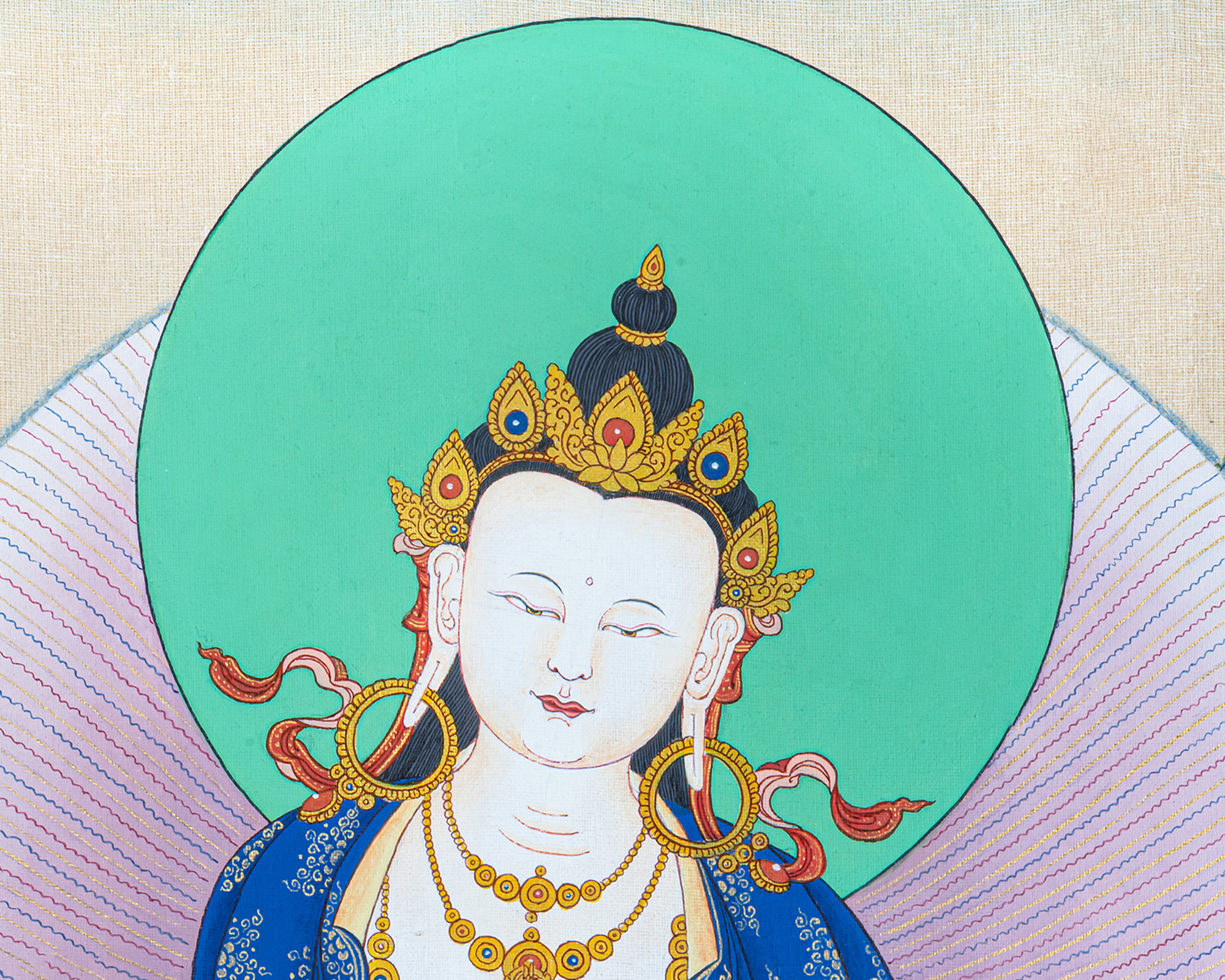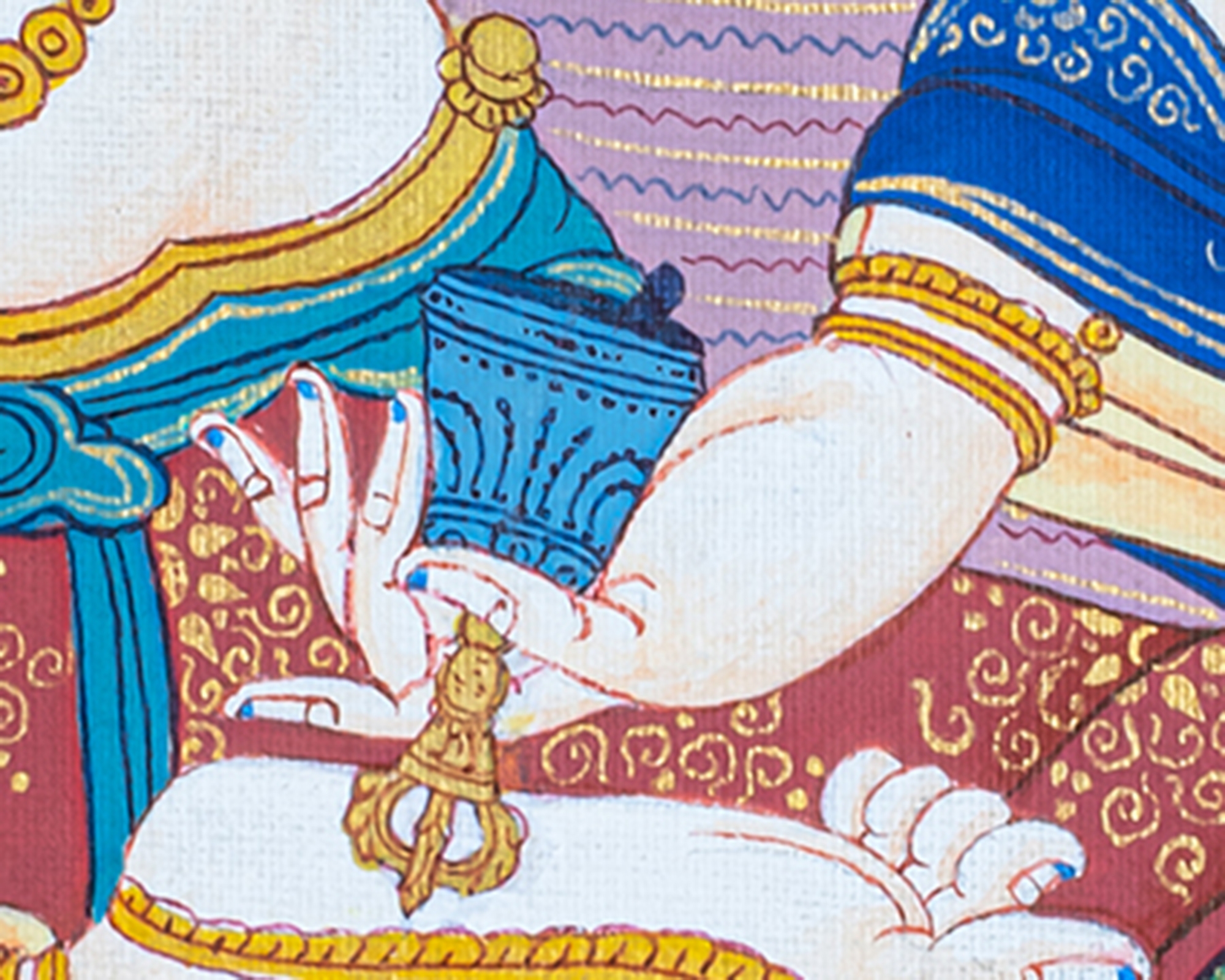 P.S. All thankas are painted taking references from Buddhist books following the correct iconography and by master artists, making it authentic traditional handmade Tibetan art. The subtle facial expression is one factor to distinguish the real effort put into creating this masterpiece.