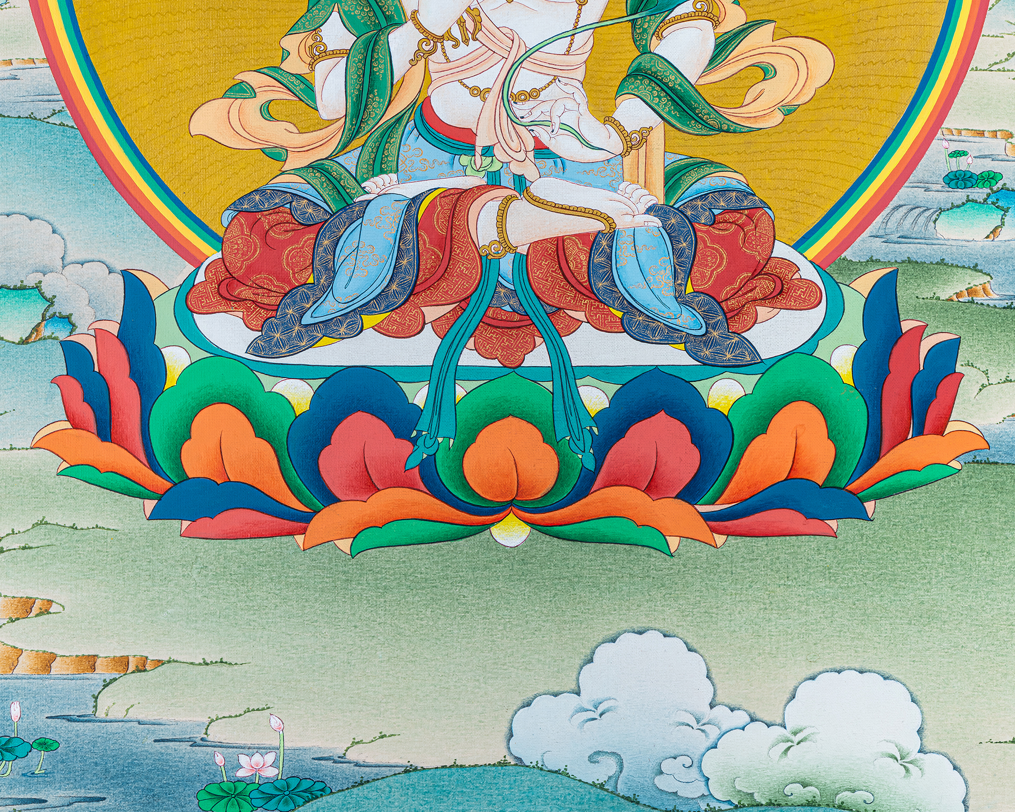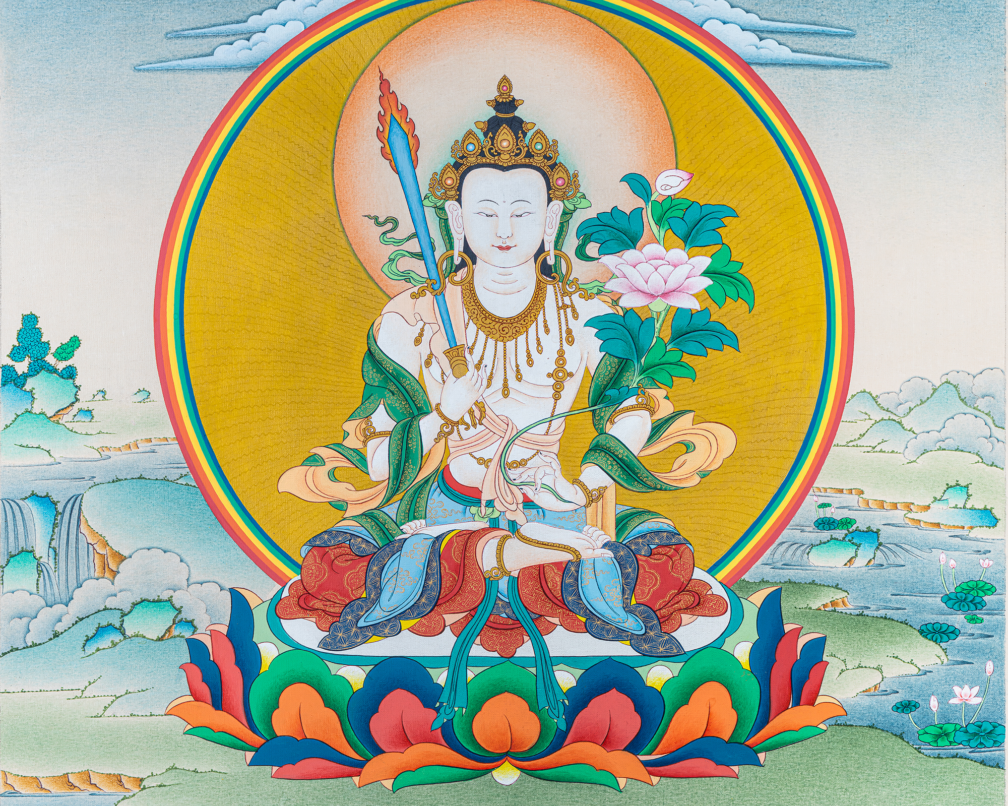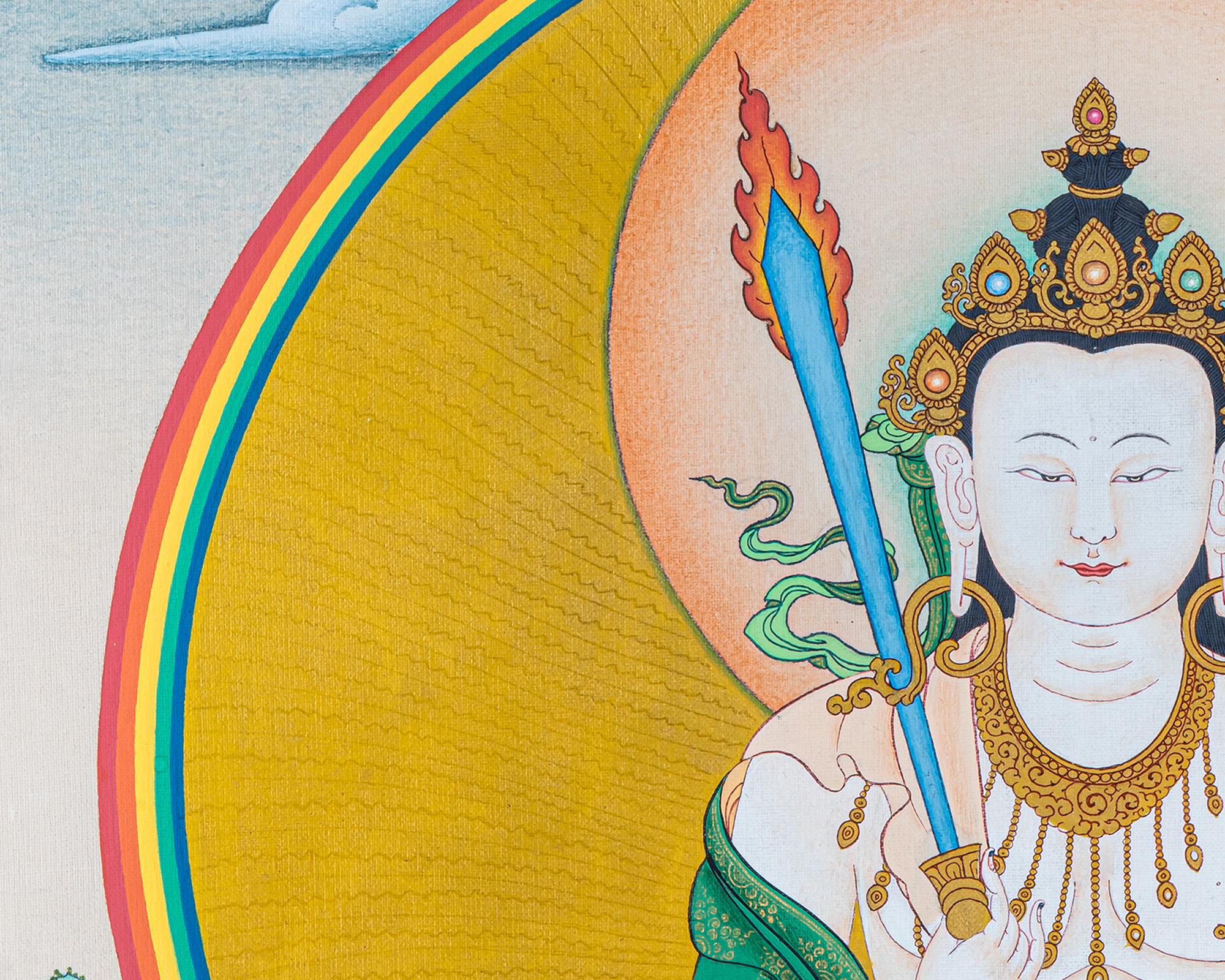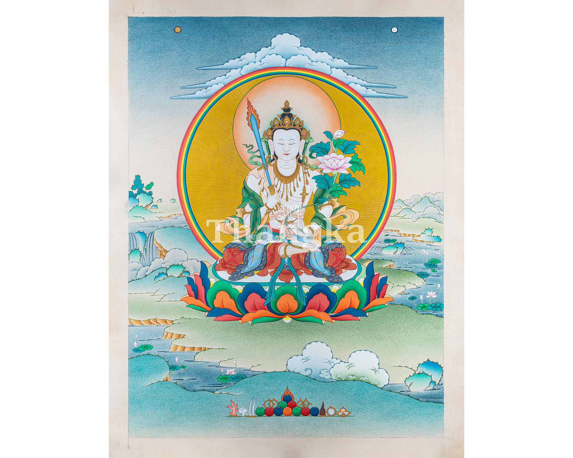 Hand-painted in the traditional Himalayan thangka style, this artwork is ideal for meditation rooms, study spaces, monasteries, and sacred art collections. White Manjushri inspires focus, discernment, and intellectual clarity, making this thangka both a beautiful devotional object and a powerful support for meditation and study.