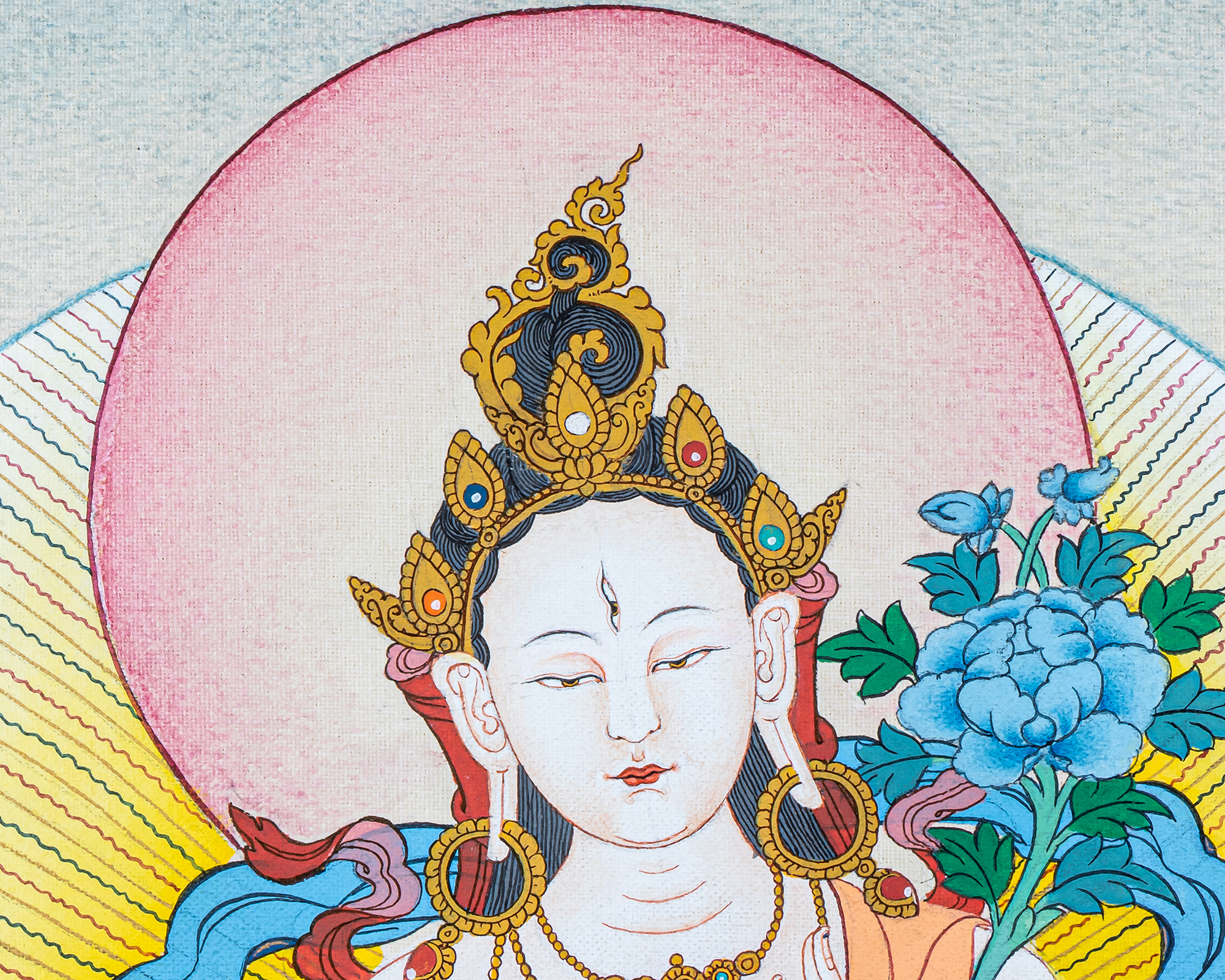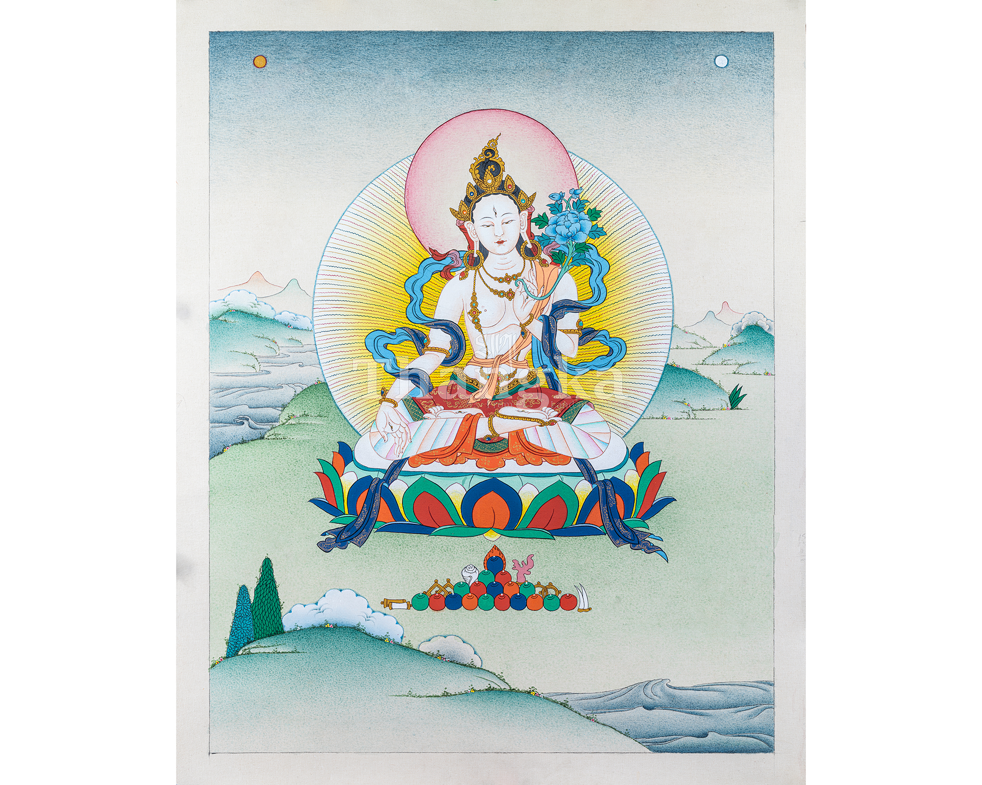 This refined White Tara Thangka portrays the compassionate goddess who embodies gentle protection, restorative energy, and awakened awareness. Seated in serene dignity on a lotus and moon disc, White Tara radiates cool clarity and soothing presence, reminding practitioners of the healing power of mindful compassion. Her seven eyes symbolize unceasing watchfulness and her vow to respond to suffering wherever it appears.