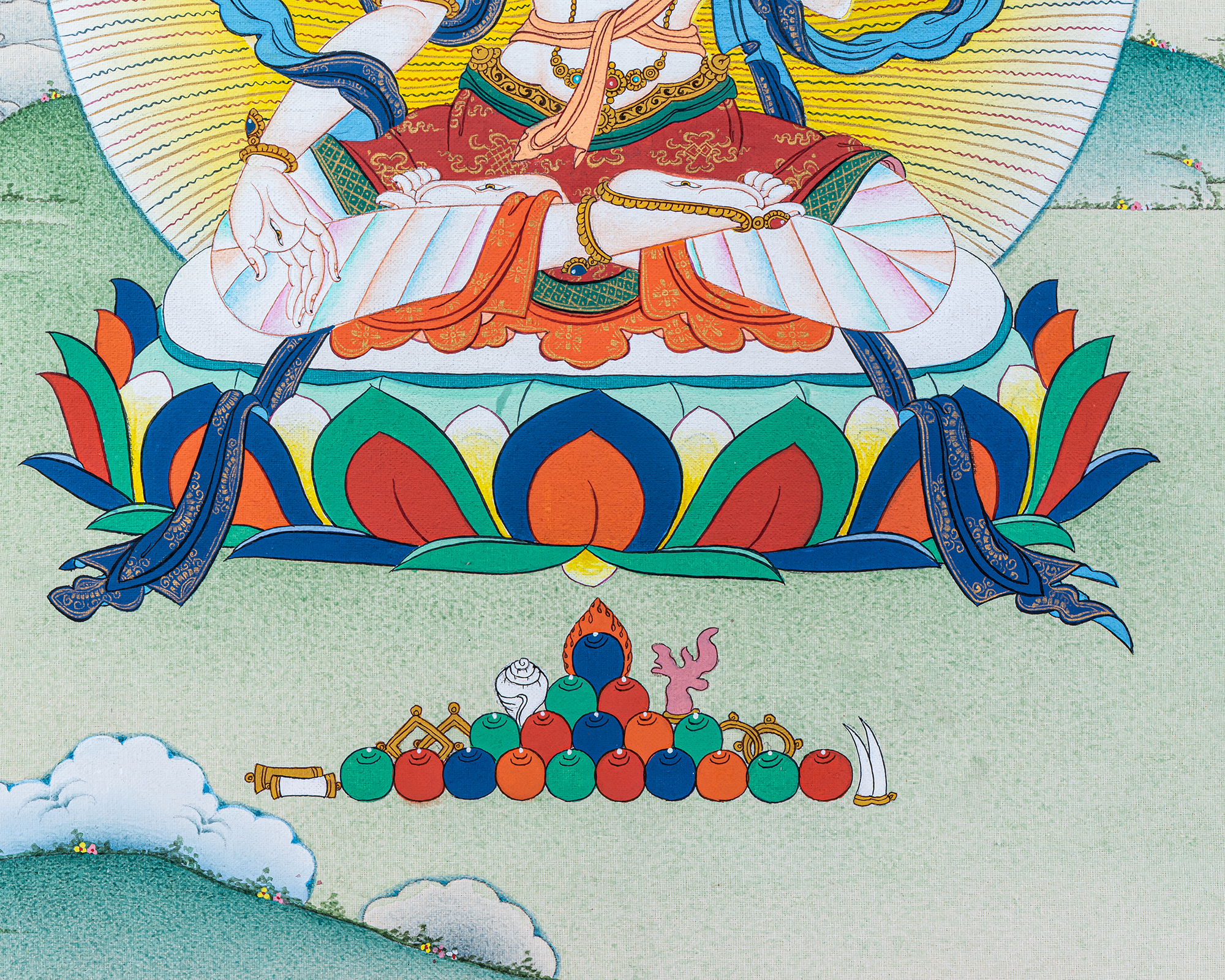 P.S. All thankas are painted taking references from Buddhist books following the correct iconography and by master artists, making it authentic traditional handmade Tibetan art. The subtle facial expression is one factor to distinguish the real effort put into creating this masterpiece.