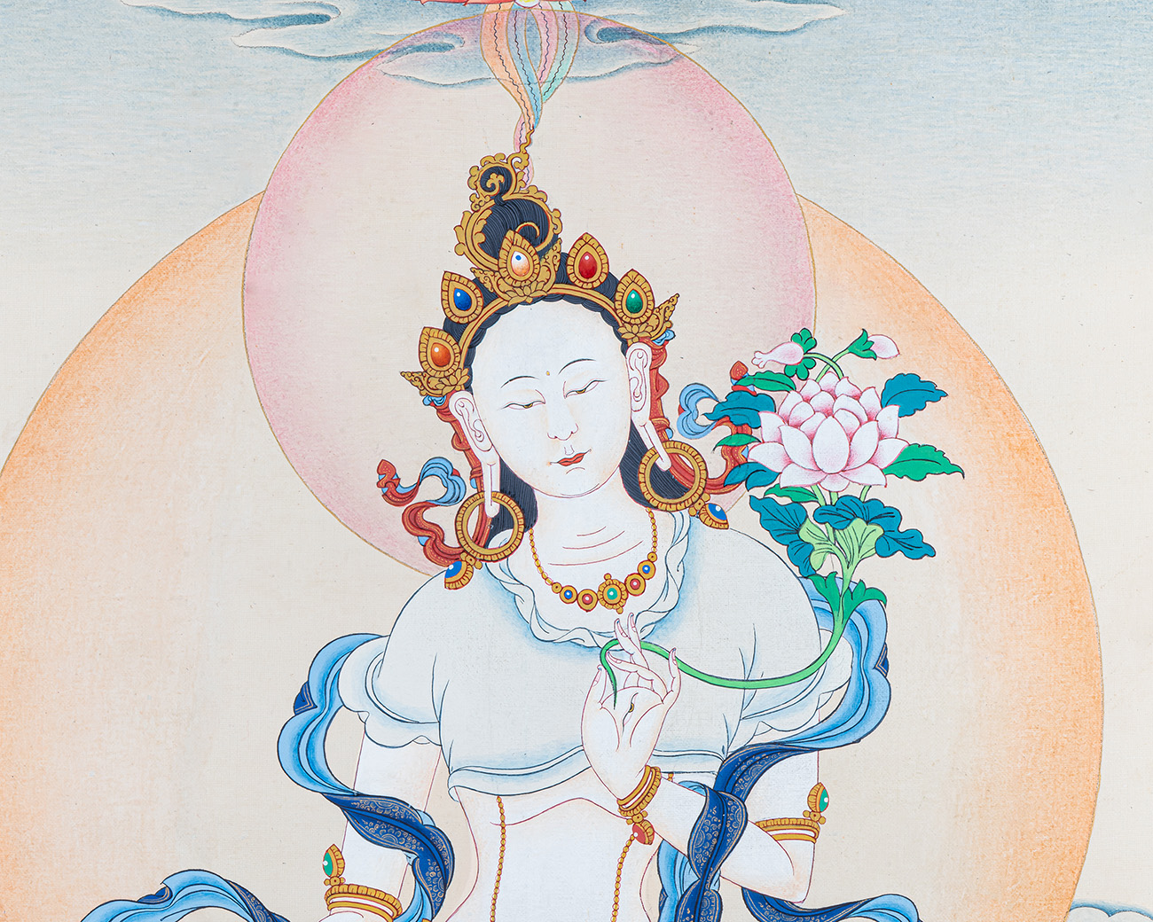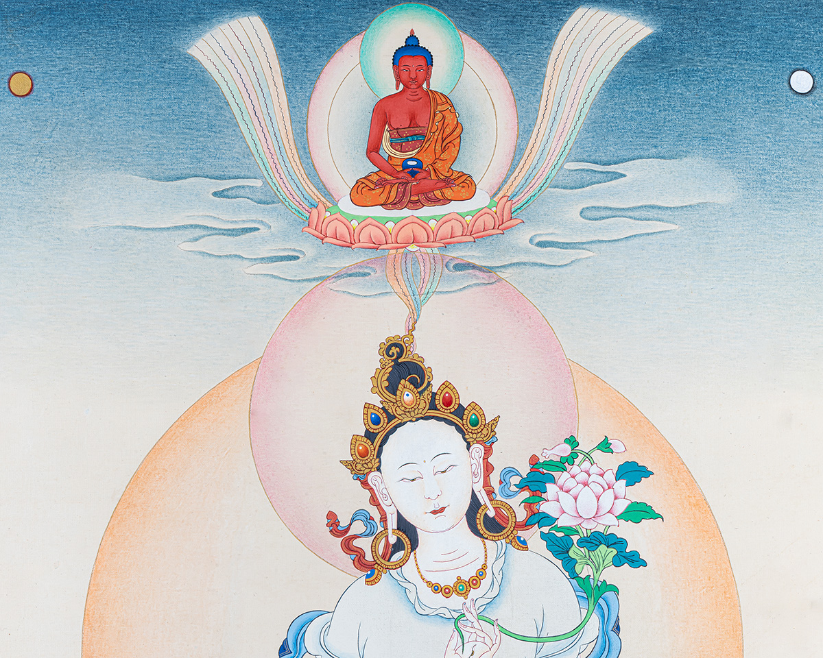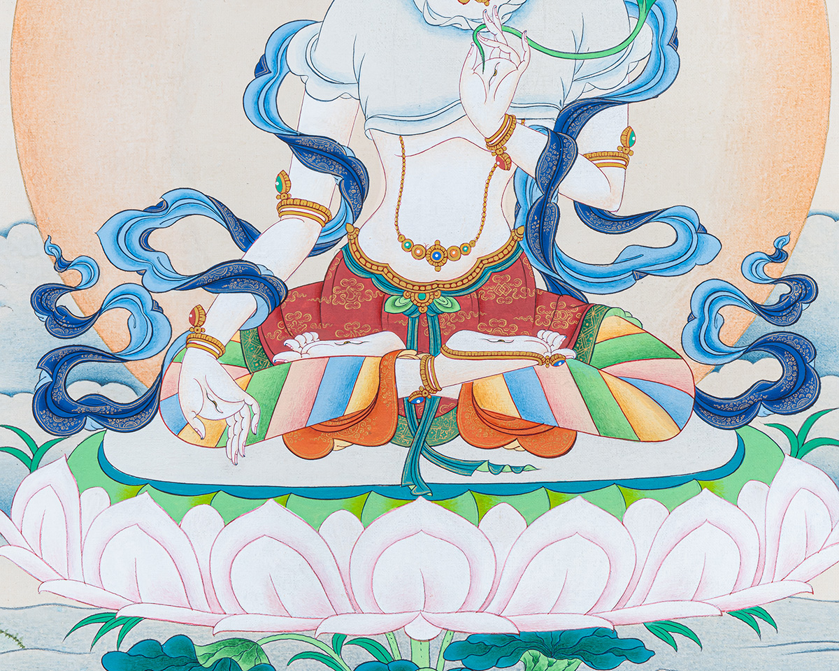 In Traditional Himalayan Thangka Art, she is portrayed seated peacefully on a lotus throne, radiating calmness and purity. Her seven eyes—symbolizing her all-seeing wisdom—reflect her ability to perceive suffering and respond with compassion. In Buddhist Thangka Painting, she represents nurturing energy and the path toward longevity and inner peace.