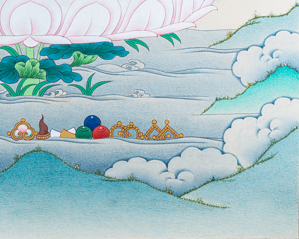 P.S. All thankas are painted taking references from Buddhist books following the correct iconography and by master artists, making it authentic traditional handmade Tibetan art. The subtle facial expression is one factor to distinguish the real effort put into creating this masterpiece.