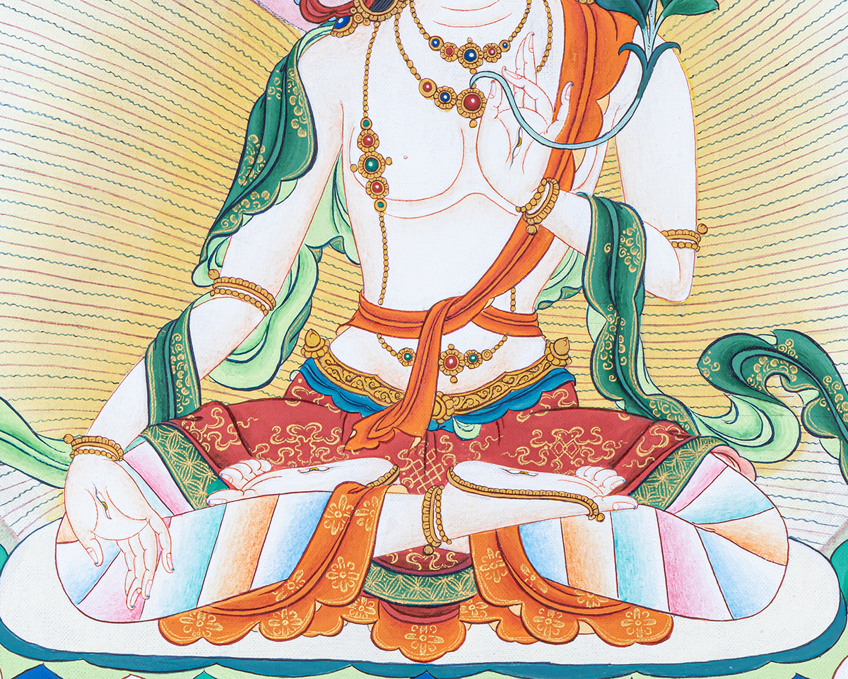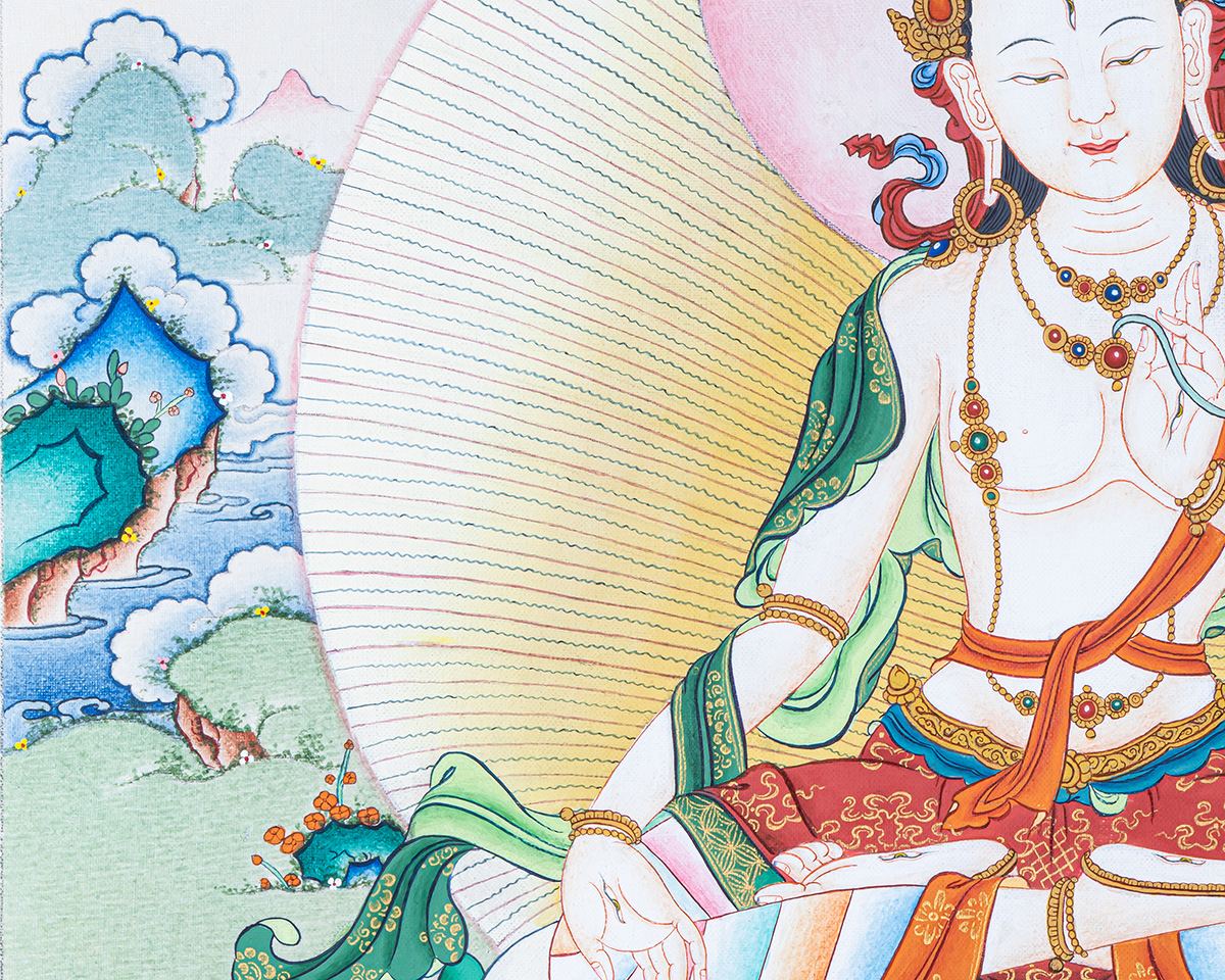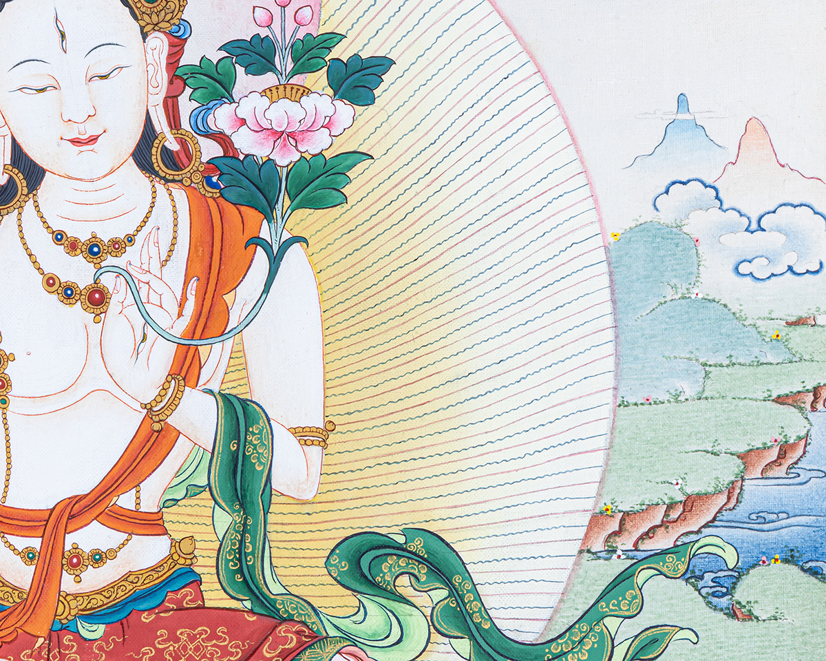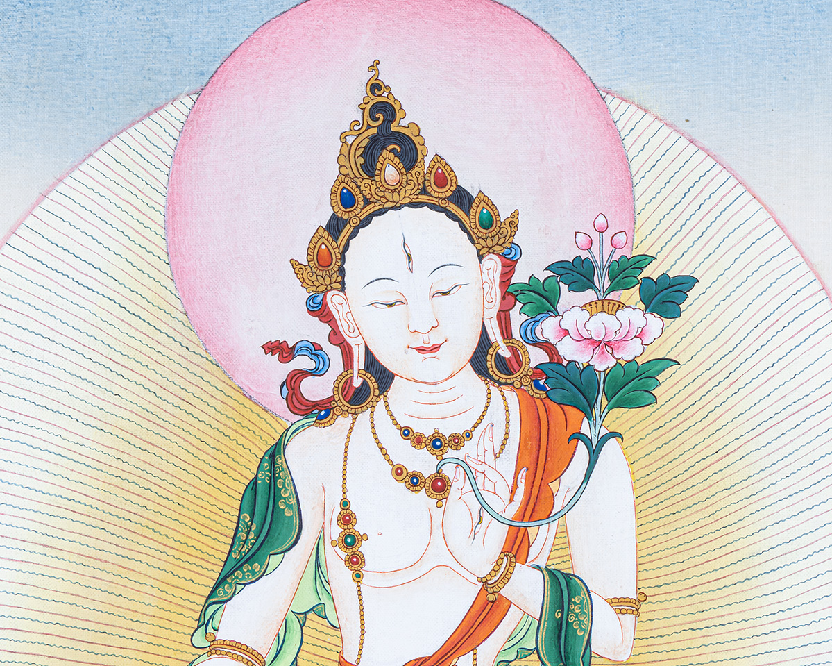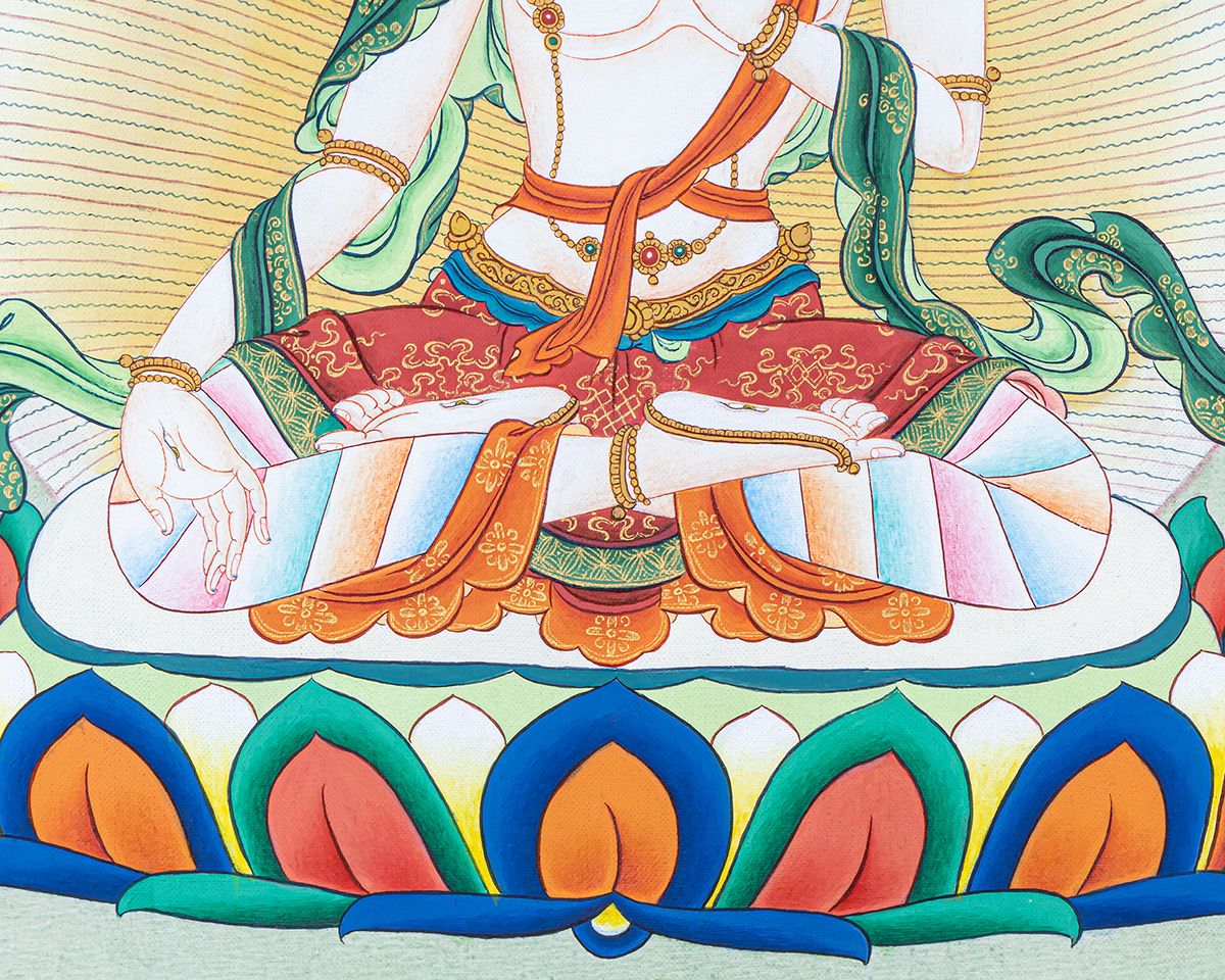 In Traditional Himalayan Thangka Art, White Tara is depicted seated serenely on a lotus throne, embodying purity, calmness, and wisdom. Her seven eyes symbolize her all-seeing compassion and her constant awareness of the suffering of all beings. In Buddhist Thangka Painting, she represents the gentle yet powerful force of healing and protection.