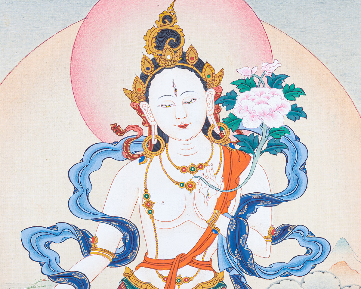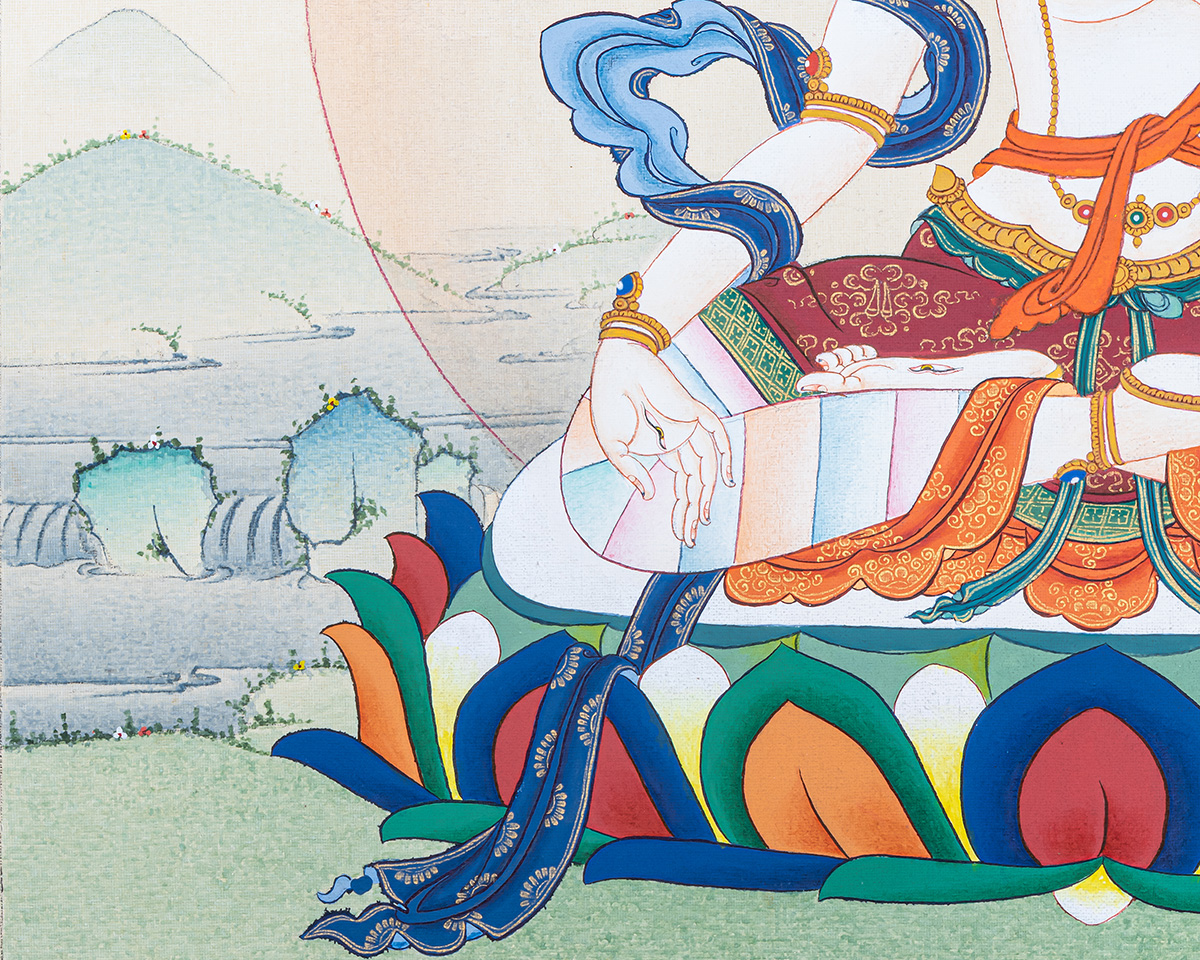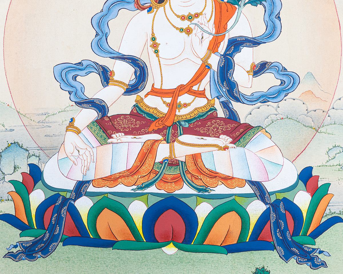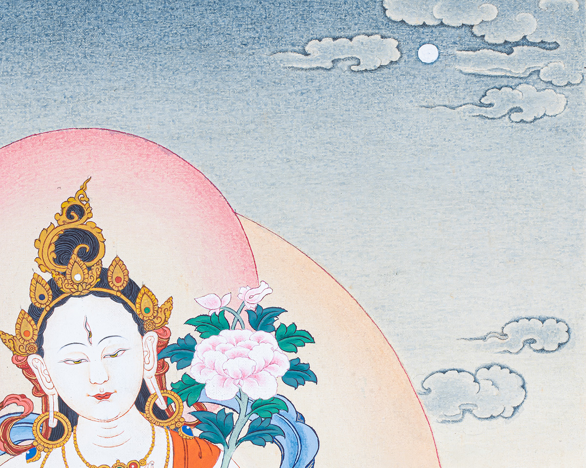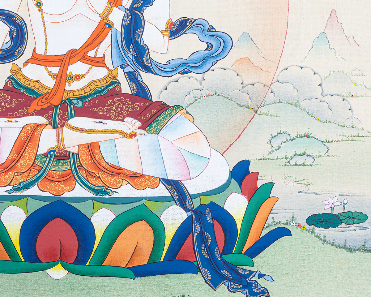 In Traditional Himalayan Thangka Art, White Tara is depicted seated in a tranquil meditative posture upon a lotus throne, radiating purity and calm energy. Her seven eyes—on her face, palms, and soles—symbolize her all-seeing wisdom and her constant vigilance toward the suffering of all beings. In Buddhist Thangka Painting, she represents the nurturing aspect of enlightened compassion.