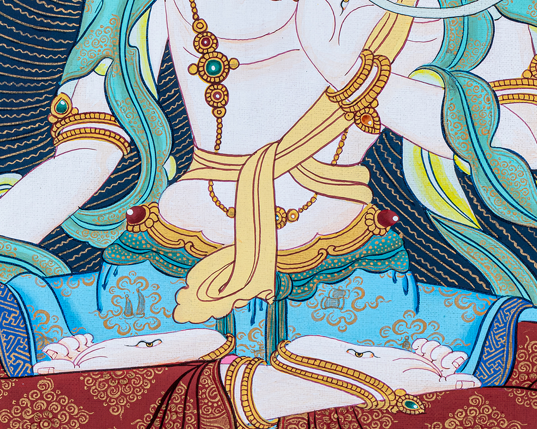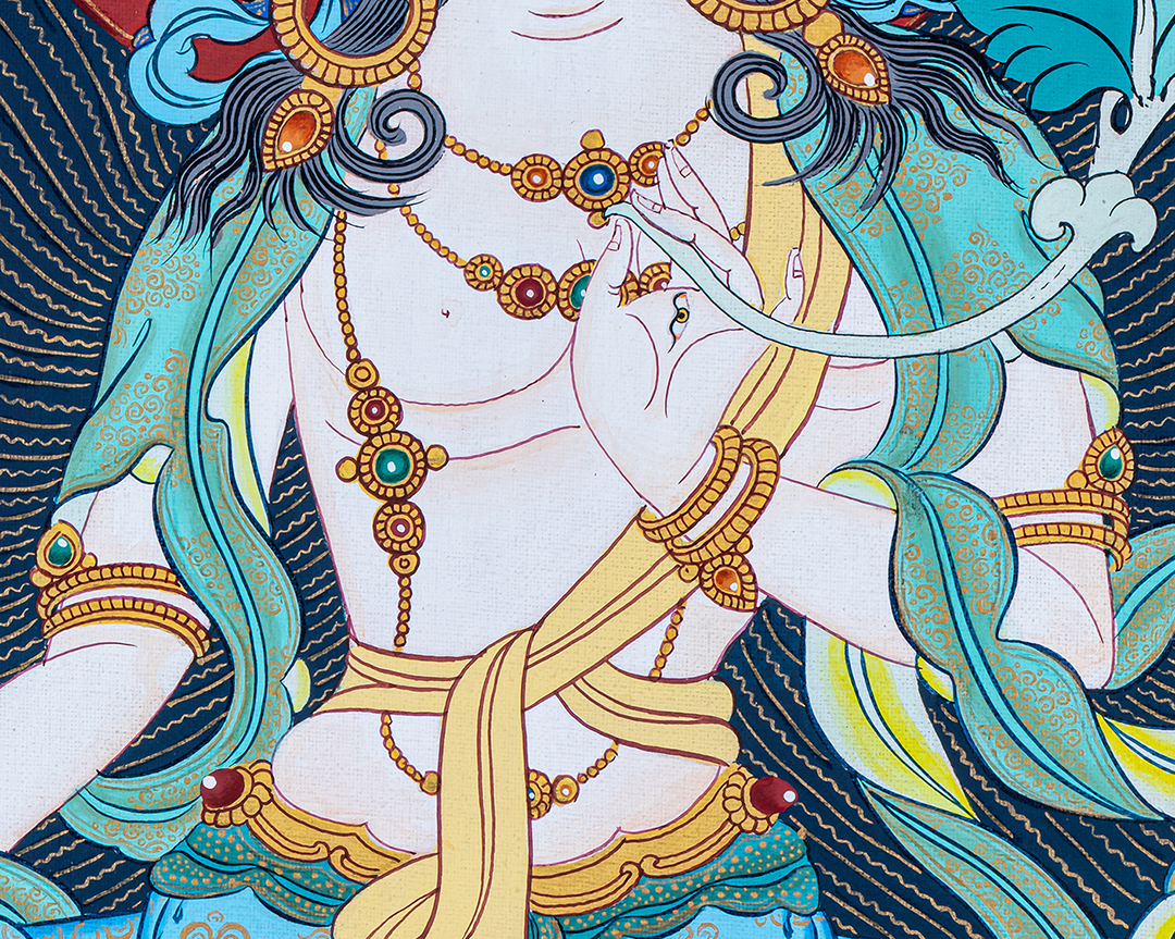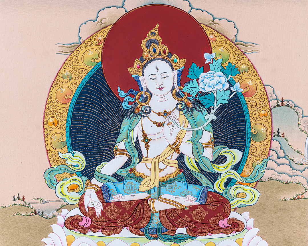 She is seen as the female aspect of the ultimate reality, and her name, "White Tara," reflects her pure and compassionate nature. She is often depicted as a beautiful woman dressed in white robes, with seven eyes symbolizing her awareness of all beings' suffering.