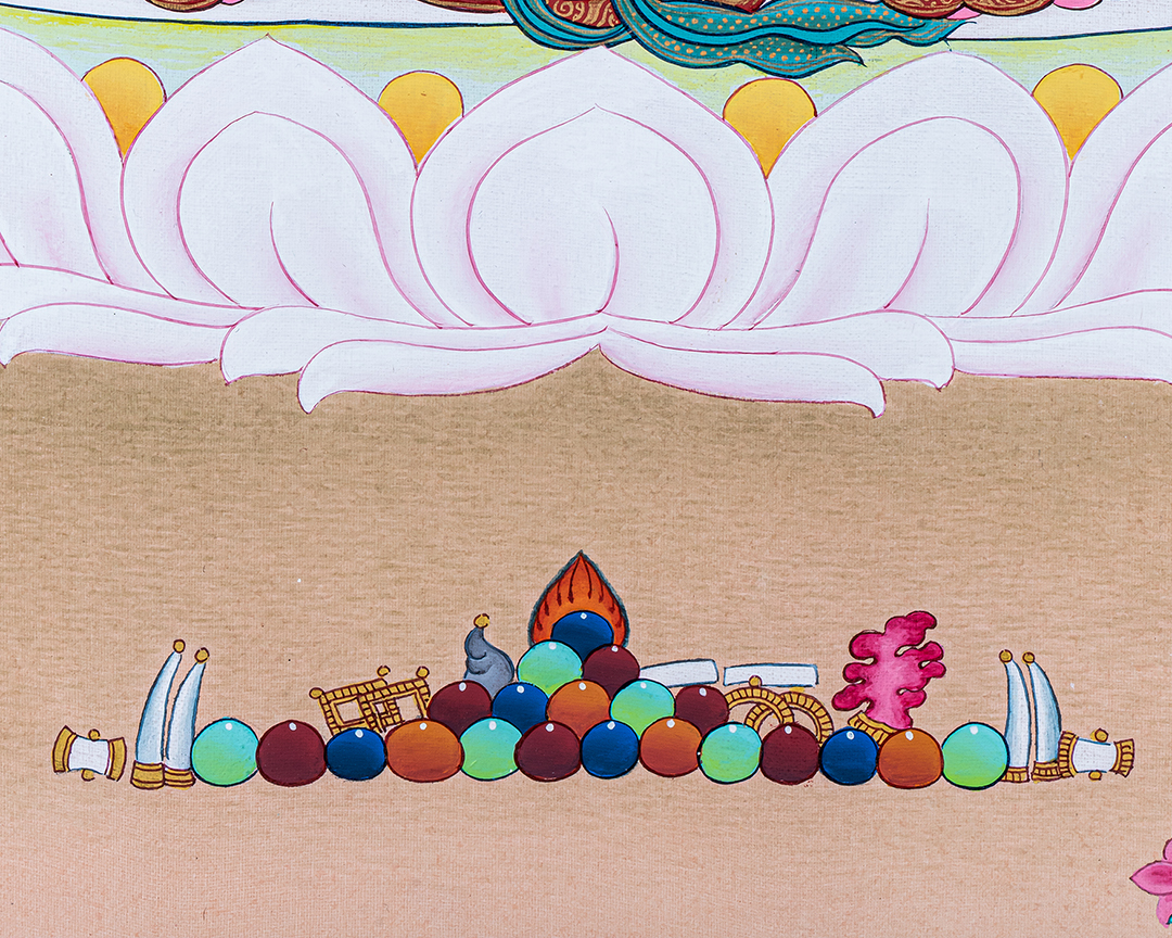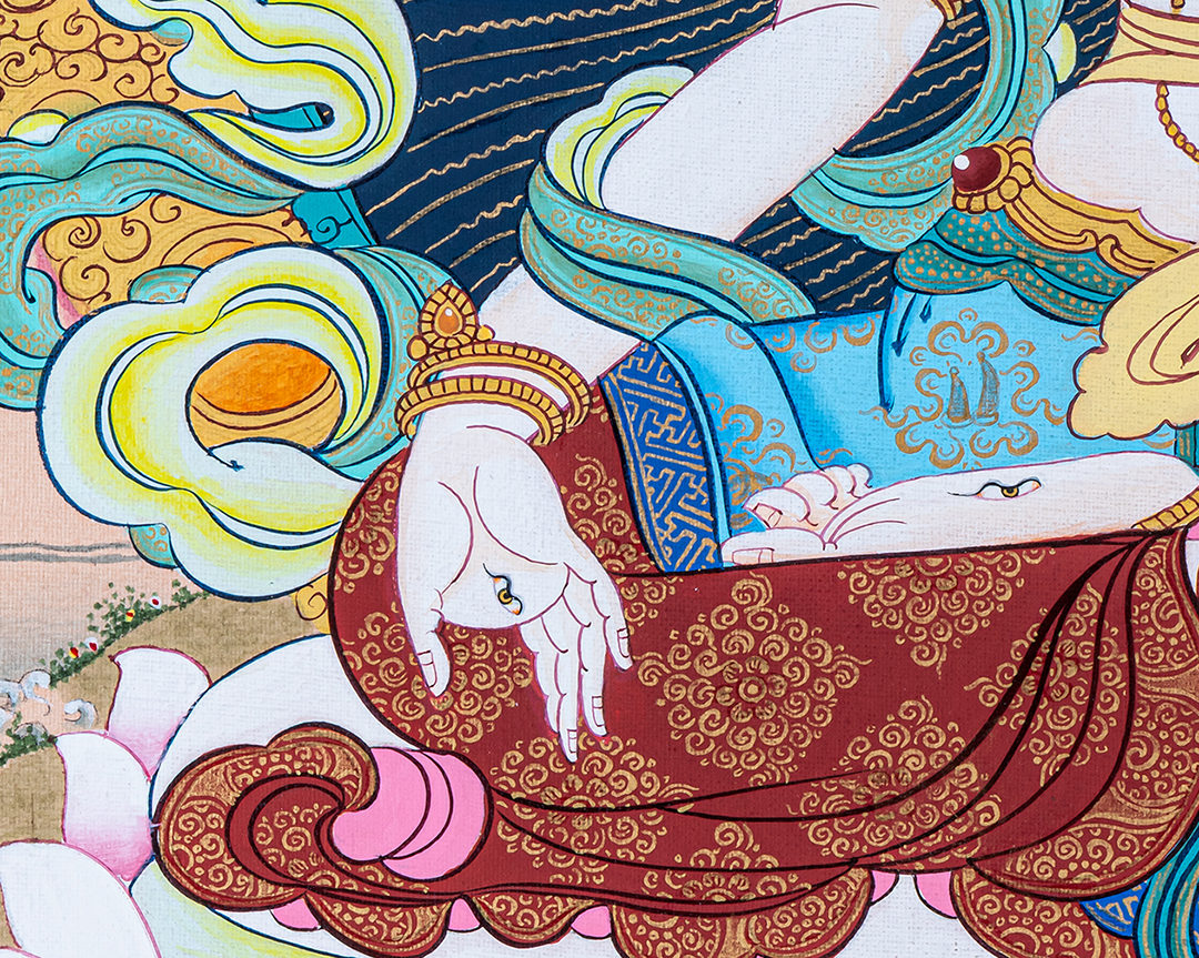 P.S. All thankas are painted taking references from Buddhist books following the correct iconography and by master artists, making it authentic traditional handmade Tibetan art. The subtle facial expression is one factor to distinguish the real effort put into creating this masterpiece.