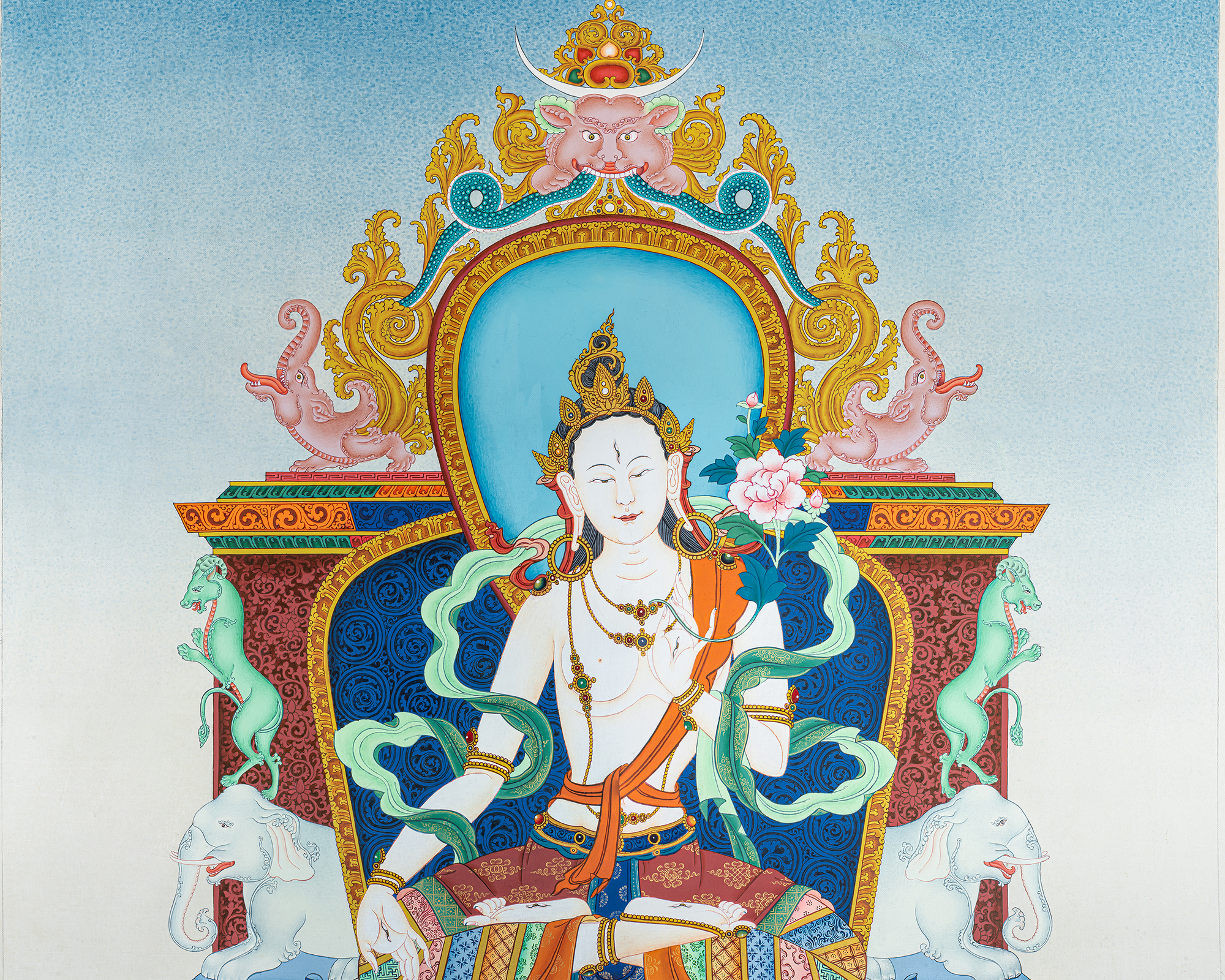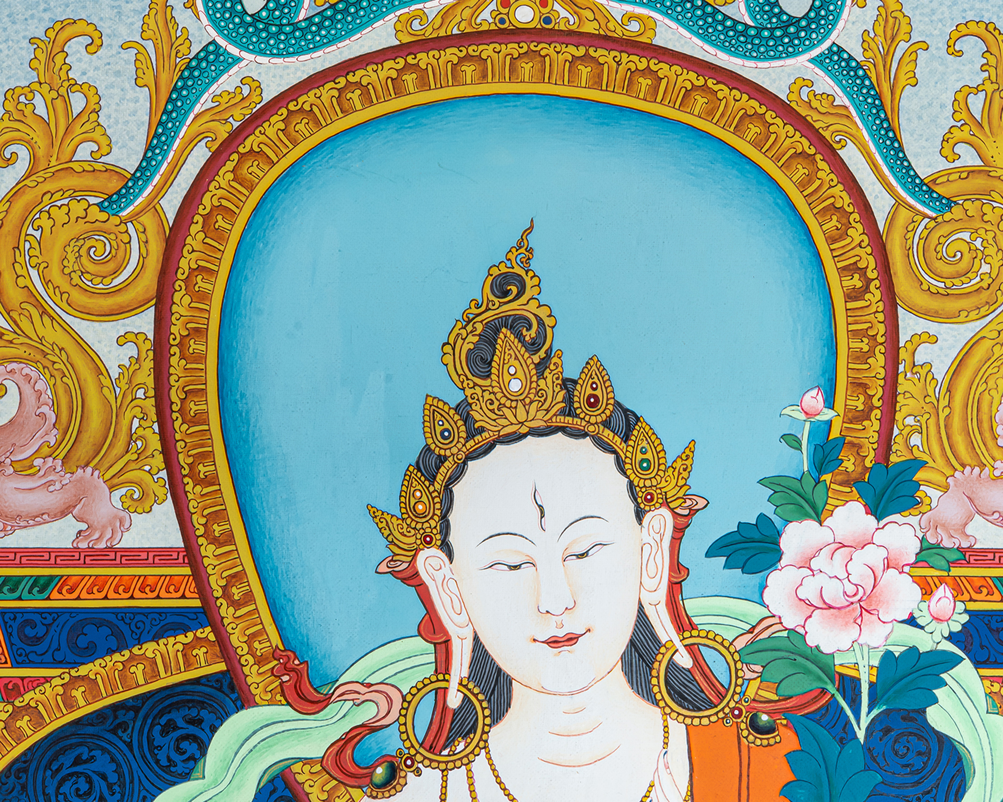 This exquisite White Tara in Throne Seat Thangka depicts the compassionate goddess seated majestically on an ornate throne, symbolizing her royal presence, spiritual authority, and boundless compassion. Radiant in her pure white form, White Tara embodies healing, longevity, and awakened wisdom. Her seven eyes—on her face, palms, and soles—represent her all-seeing awareness and her constant vigilance over the suffering of all beings.