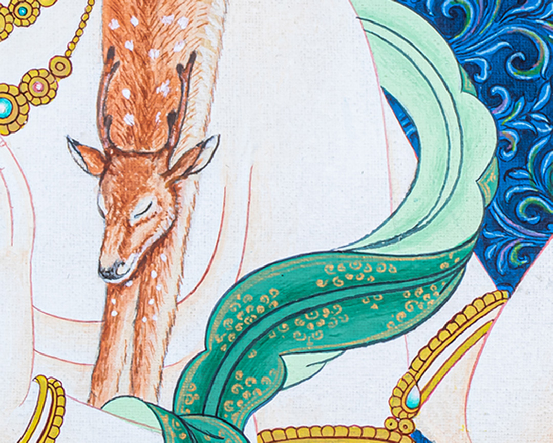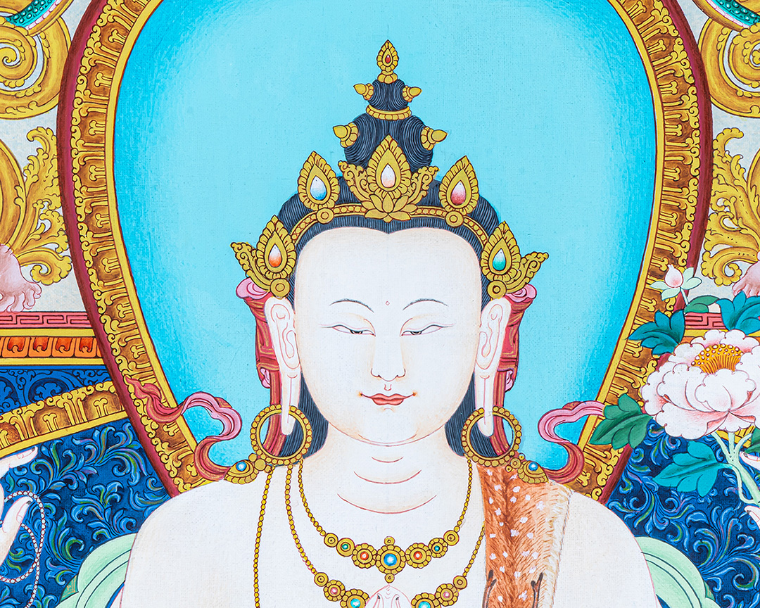 In Tibetan iconography, Chenrezig often appears in his four-armed form, symbolizing his infinite ability to help sentient beings. His first pair of hands is joined at the heart, holding a radiant jewel that represents the awakened mind and the pure intention to benefit all beings. In his other hands, he holds a crystal mala, signifying continuous compassionate action, and a lotus flower, representing purity unstained by worldly negativity. His peaceful expression and luminous white body reflect his nature—pure, kind, and all-embracing.
